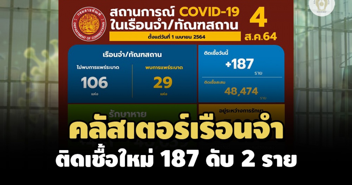 ผู้สื่อข่าวรายงานว่า เมื่อวันที่ 4 ส.ค.2564 นายอายุตม์ สินธพพันธุ์ อธิบดีกรมราชทัณฑ์ เปิดเผยถึงสถานการณ์การแพร่ระบาดของโรคติดเชื้อไวรัสโควิดในเรือนจำและทัณฑสถาน พบผู้ติดเชื้อรายใหม่ 187 ราย มาจากการพบในเรือนจำสีแดง 165 ราย และพบในห้องแยกกักโรคผู้ต้องขังรับใหม่ 22 ราย รักษาหายเพิ่ม 481 ราย เสียชีวิต 2 ราย รวมมีผู้ติดเชื้อที่ยังอยู่ในการดูแลของกรมราชทัณฑ์ 7,209 ราย แบ่งเป็น กลุ่มสีเขียว 81.5% สีเหลือง 18.1% และสีแดง 0.4% เป็นพื้นที่ กทม. 651 ราย ปริมณฑล 2,017 ราย และต่างจังหวัด 4,541 ราย