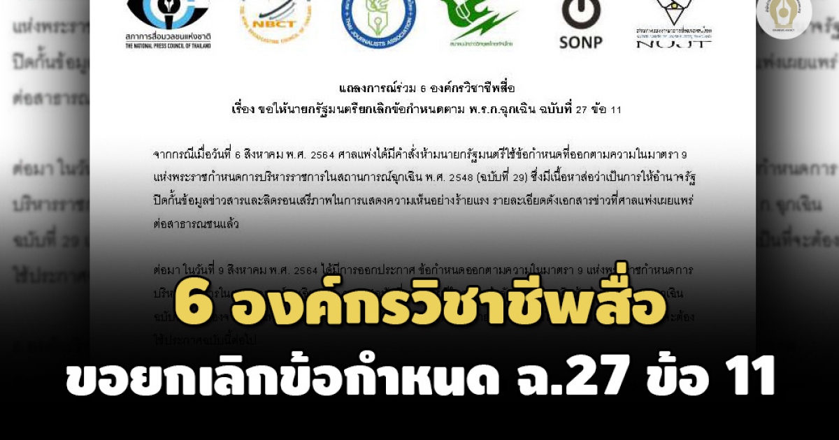 ผู้สื่อข่าวรายงานว่า เมื่อวันที่ 11 ส.ค.2564 องค์กรวิชาชีพสื่อ 6 แห่ง ประกอบด้วย สภาการสื่อมวลชนแห่งชาติ สภาวิชาชีพข่าววิทยุและโทรทัศน์ไทย สมาคมนักข่าวนักหนังสือพิมพ์แห่งประเทศไทย สมาคมนักข่าววิทยุและโทรทัศน์ไทย สมาคมผู้ผลิตข่าวออนไลน์ และสหภาพแรงงานกลางสื่อมวลชนไทย อออกแถลงการณ์ เรื่อง ขอให้นายกรัฐมนตรียกเลิกข้อกำหนดตาม พ.ร.ก.ฉุกเฉิน ฉบับที่ 27 ข้อ 11 ระบุว่า