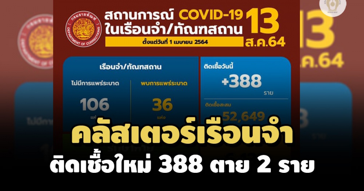 ผู้สื่อข่าวรายงานว่า เมื่อวันที่ 13 ส.ค.2564 นายวัลลภ นาคบัว รองปลัดกระทรวงยุติธรรม และโฆษก ศบค.ยธ. เปิดเผยว่า ภาพรวมการแพร่ระบาดของโรคติดเชื้อไวรัสโควิดในเรือนจำและทัณฑสถานวันนี้ พบเรือนจำกลางนครสวรรค์ระบาดเพิ่ม 1 แห่ง ส่งผลให้มีเรือนจำสีแดง 36 แห่ง และเรือนจำสีขาวที่ไม่มีการแพร่ระบาด 106 แห่ง ขณะที่ ผู้ติดเชื้อรายใหม่พบเพิ่ม 388 ราย มาจากพบในเรือนจำสีแดง 302 ราย และพบในห้องแยกกักโรคผู้ต้องขังรับใหม่ 86 ราย รักษาหายเพิ่ม 293 ราย เสียชีวิต 2 ราย ทำให้มีผู้ติดเชื้อที่ยังอยู่ในการดูแลของกรมราชทัณฑ์ 6,139 ราย แบ่งเป็นกลุ่มสีเขียว 86.4% สีเหลือง 13.2% และสีแดง 0.4% เป็นพื้นที่ กทม. 373 ราย ปริมณฑล 1,784 ราย และต่างจังหวัด 3,982 ราย โดยมีผู้ติดเชื้อรักษาหายสะสม 45,785 ราย หรือ 87% ของผู้ติดเชื้อสะสม 52,649 ราย เสียชีวิตสะสม 82 ราย คิดเป็นอัตรา 0.15% ของผู้ติดเชื้อสะสม