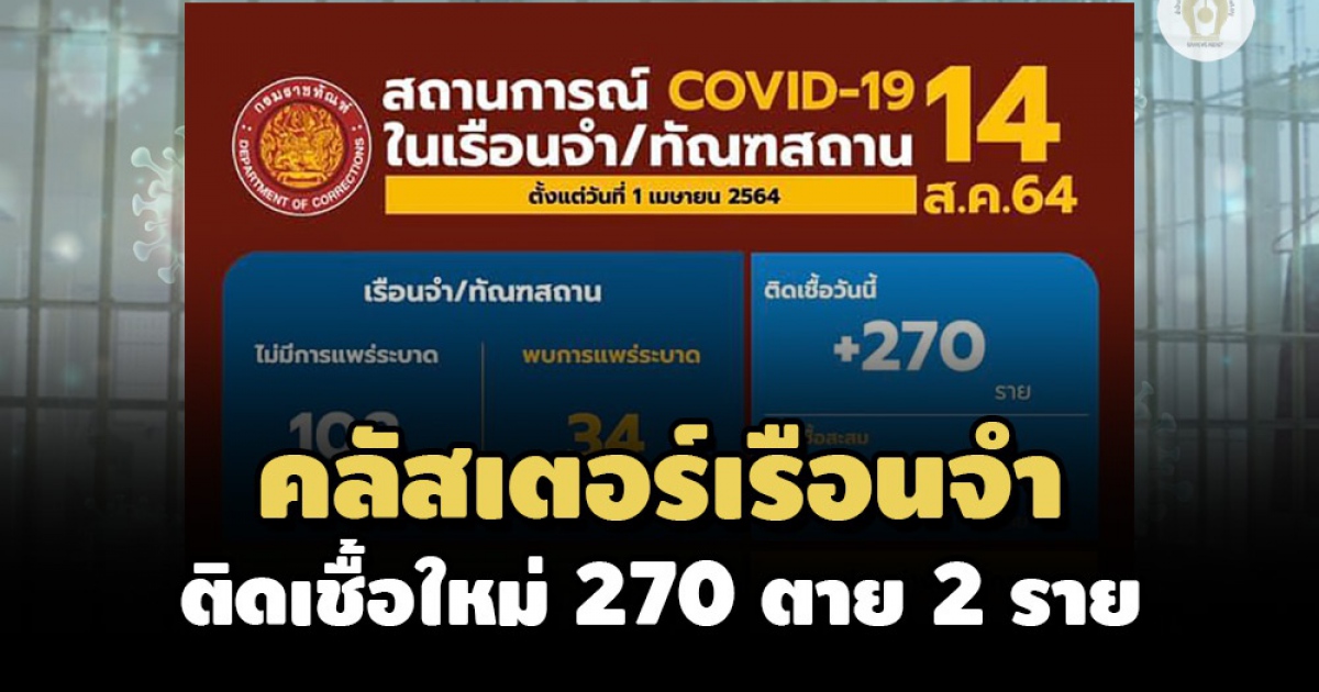 ผู้ต้องขังติดเชื้อใหม่ 270 ราย รักษาหายอีก 432 ราย เสียชีวิต 2 ราย กรมราชทัณฑ์เผยเรือนจำพ้นการระบาดเพิ่ม 2 แห่ง รวมไม่มีการระบาดแล้ว 108 แห่ง