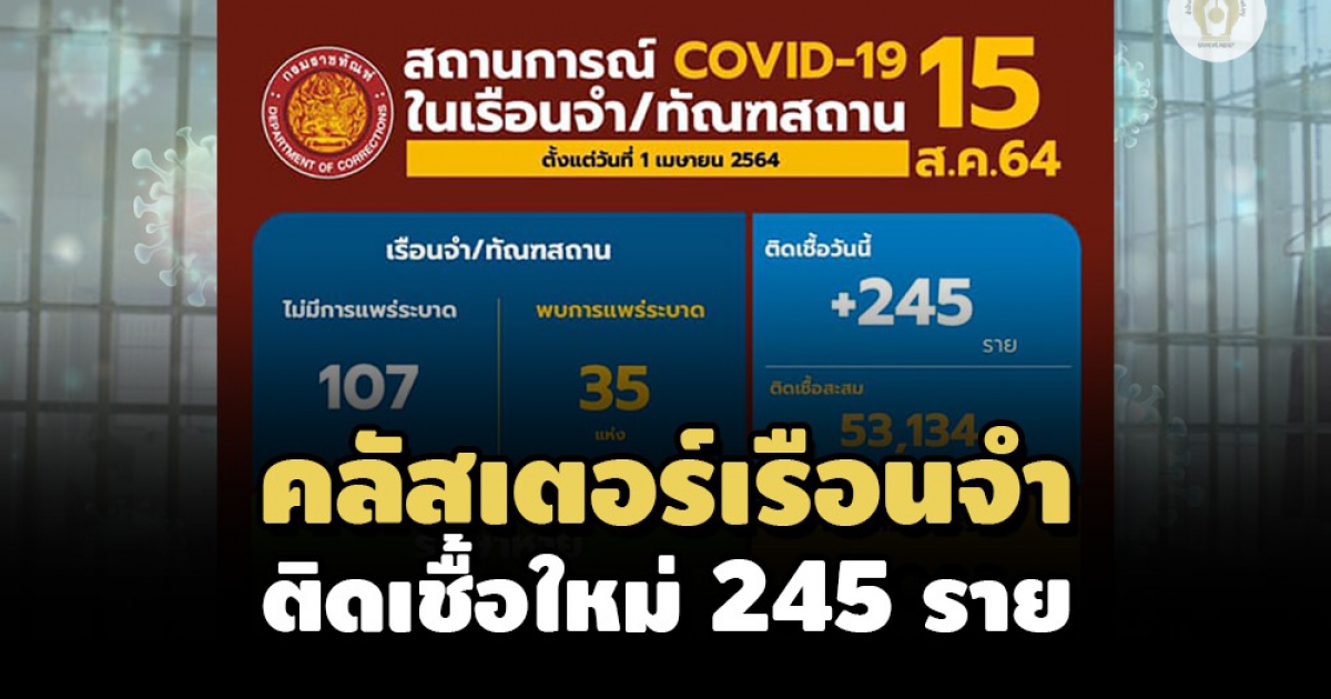 ผู้สื่อข่าวรายงานว่า เมื่อวันที่ 15 ส.ค.2564 นายอายุตม์ สินธพพันธุ์ อธิบดีกรมราชทัณฑ์ เปิดเผยถึงสถานการณ์การแพร่ระบาดของโรคติดเชื้อไวรัสโควิดในเรือนจำและทัณฑสถาน พบผู้ติดเชื้อรายใหม่ 245 ราย มาจากการพบในเรือนจำสีแดง 155 ราย และพบในห้องแยกกักโรคผู้ต้องขังรับใหม่ 90 ราย รักษาหายเพิ่ม 77 ราย ไม่มีรายงานผู้เสียชีวิตในวันนี้ ทำให้มีผู้ติดเชื้อที่ยังอยู่ในการดูแลของกรมราชทัณท์ 6,093 ราย แบ่งเป็นกลุ่มสีเขียว 87.4% สีเหลือง 12.19 และสีแดง 0.5% เป็นพื้นที่ กทม. 223 ราย ปริมณฑล 1,757 ราย และต่างจังหวัด 4,113 ราย