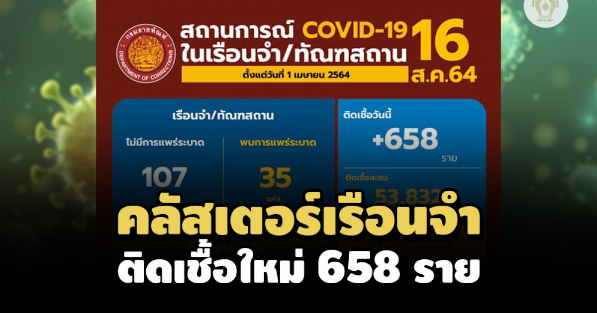 ผู้สื่อข่าวราบงานว่า เมื่อวันที่ 16 ส.ค.2564 นายอายุตม์ สินธพพันธุ์ อธิบตีกรมราชทัณฑ์ เปิดเผยถึงสถานการณ์การแพร่ระบาดของโรคติดเชื้อไวรัสโควิดในเรือนจำและทัณฑสถาน พบผู้ติดเชื้อรายใหม่ 658 ราย มาจากพบในเรือนจำสีแดง 635 ราย และพบในห้องแยกกักโรคผู้ต้องขังรับใหม่ 23 ราย รักษาหายเพิ่ม 222 ราย ไม่มีรายงานผู้เสียชีวิต ทำให้มีผู้ติดเชื้อที่ยังอยู่ในการดูแลของกรมราชทัณท์ 6,536 ราย แบ่งเป็นกลุ่มสีเขียว 88.2% สีเหลือง 11.496 และสีแดง 0.49 เป็นพื้นที่ กทม. 240 ราย ปริมณฑล 1,721 ราย และต่างจังหวัด 4,575 ราย