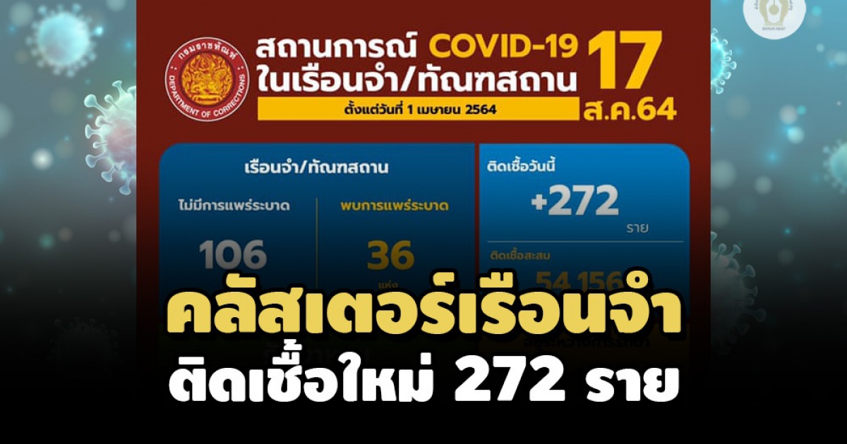 ขณะที่ ผู้ติดเชื้อรายใหม่วันนี้ พบเพิ่ม 272 ราย มาจากการพบในเรือนจำสีแดง 251 ราย และพบในห้องแยกกักโรคผู้ต้องขังรับใหม่ 21 ราย รักษาหายเพิ่ม 667 ราย ไม่มีรายงานผู้เสียชีวิตในวันนี้ต่อเนื่องเป็นวันที่ 3 ทำให้มีผู้ติดเชื้อที่ยังอยู่ในการดูแลของกรมราชทัณฑ์ 6,164 ราย แบ่งเป็น กลุ่มสีเขียว 88.9% สีเหลือง 10.6% และสีแดง 0.5% เป็นพื้นที่ กทม. 190 ราย ปริมณฑล 1,253 ราย และต่างจังหวัด 4,721 ราย โดยมีผู้ติดเชื้อรักษาหายสะสม 47,228 ราย หรือ 87.2% ของผู้ติดเชื้อสะสม 54,156 ราย เสียชีวิตสะสม 84 ราย คิดเป็นอัตรา 0.16% ของผู้ติดเชื้อสะสมทั้งหมด
