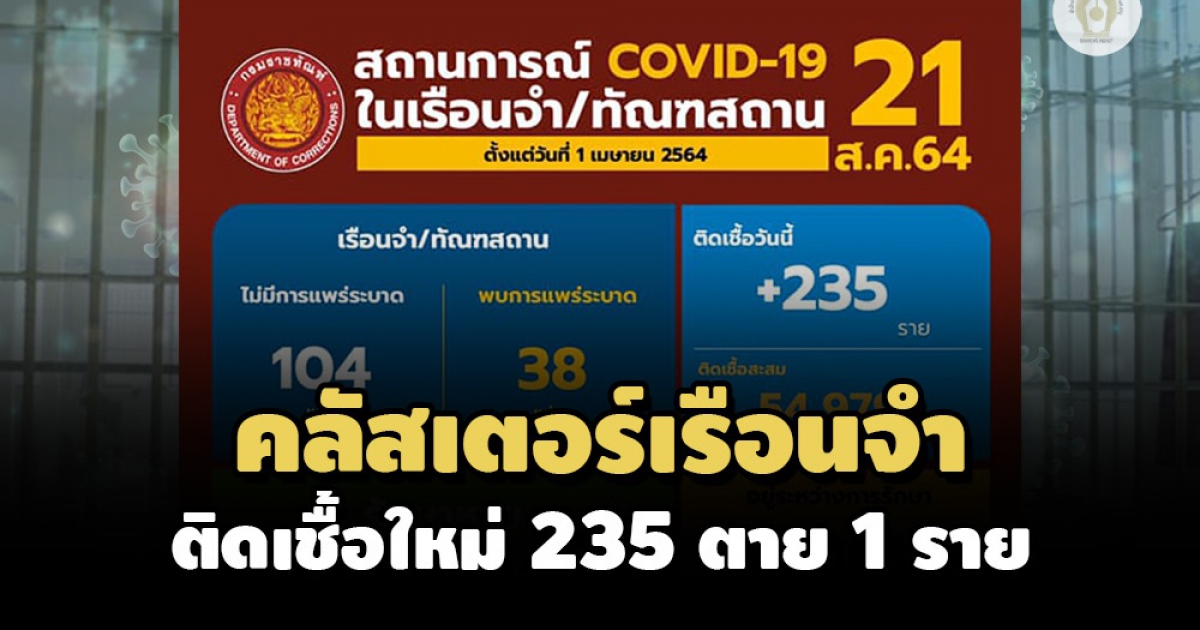 ผู้ต้องขังติดเชื้อใหม่ 235 ราย รักษาหายเพิ่ม 600 ราย ผู้ติดเชื้อรักษาหายสะสมแล้ว 90.6% เสียชีวิต 1 ราย กรมราชทัณฑ์เผยพบเรือนจำแพร่ระบาดเพิ่ม 2 แห่ง