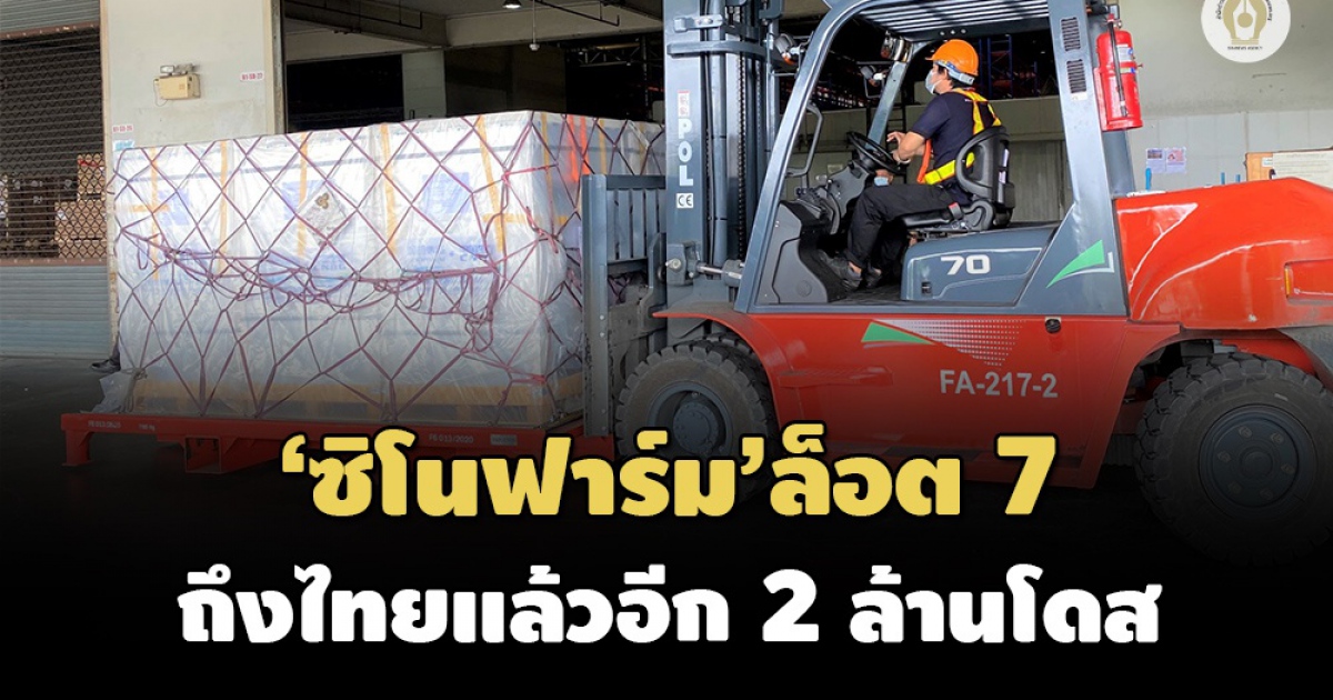 'ราชวิทยาลัยจุฬาภรณ์' แจ้งวัคซีนซิโนฟาร์มล็อตที่ 7 จำนวน 2 ล้านโดสถึงไทยแล้ว รวมจำนวนวัคซีนที่เข้ามาในประเทศไทยทั้งหมด เป็นจำนวน 9 ล้านโดส
