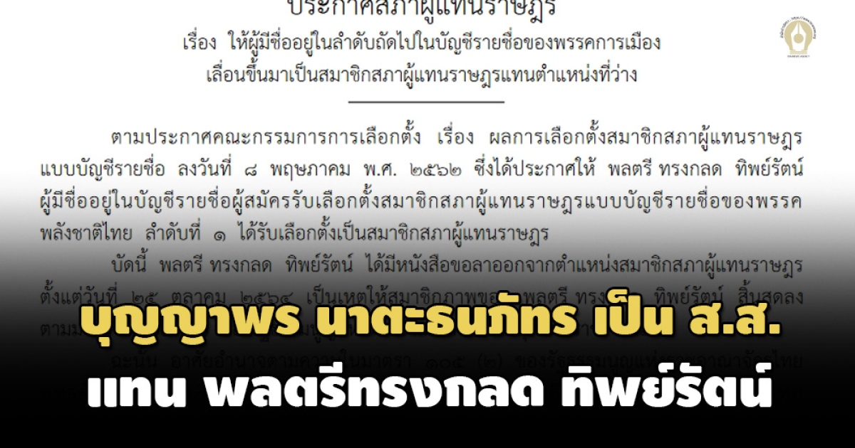 เลื่อน ‘บุญญาพร นาตะธนภัทร’ เป็น ส.ส.แบบบัญชีรายชื่อ พรรคพลังชาติไทยแทน พล.ต.ทรงกลด ทิพย์รัตน์ ขอลาออกจากตำแหน่ง