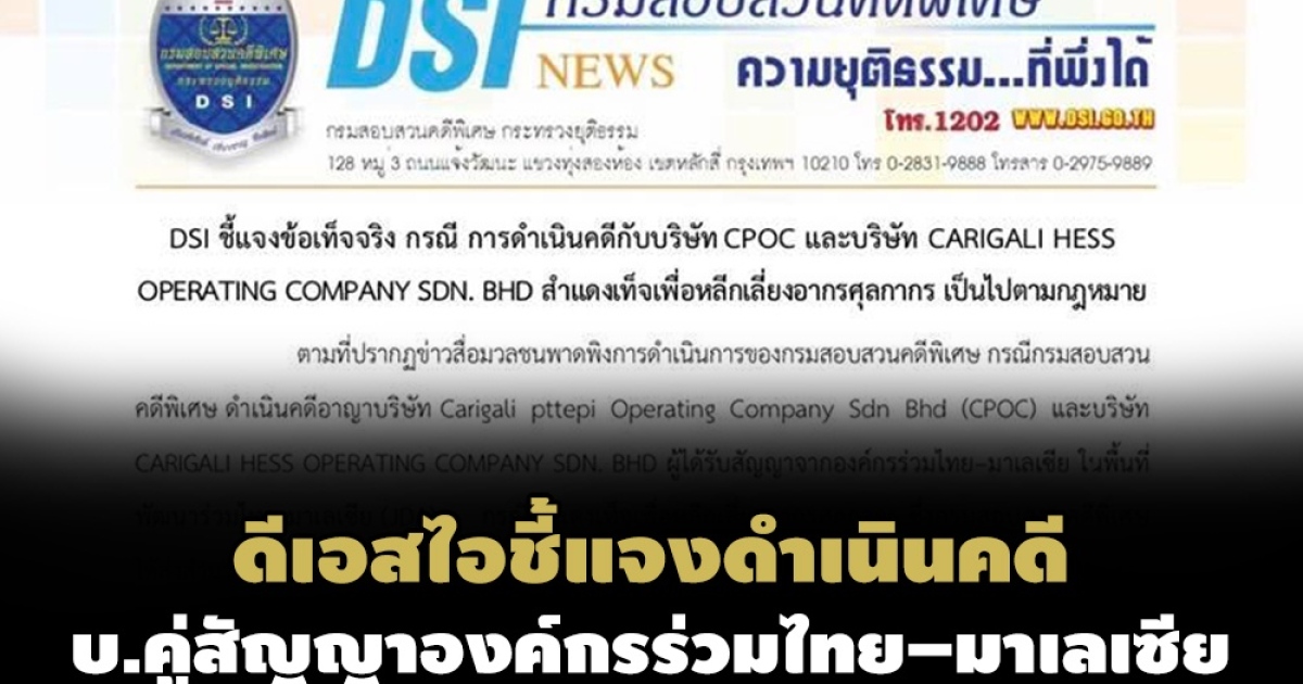 DSI ชี้แจงข้อเท็จจริงกรณีดำเนินคดี กับบริษัท CPOC และบริษัท CARIGALI HESS OPERATING COMPANY SDN. BHD คู่สัญญา องค์กรร่วมไทย–มาเลเซีย สำแดงเท็จเพื่อหลีกเลี่ยงอากรศุลกากร ทำตามกฎหมาย อัยการสูงสุดสั่งฟ้องแล้ว กำลังติดตามตัวผู้เกี่ยวข้องส่งฟ้อง