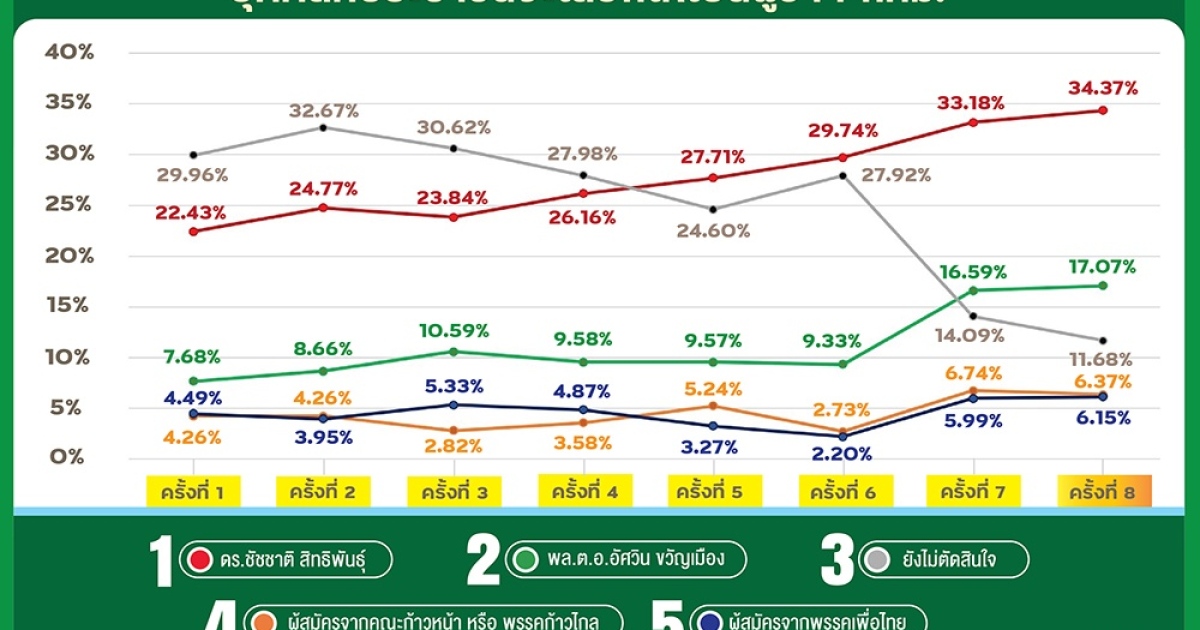 "...สถาบันบัณฑิตพัฒนบริหารศาสตร์ (นิด้า) เปิดเผยผลสำรวจของประชาชน เรื่อง “อยากได้ใคร เป็นผู้ว่าฯ กทม. ครั้งที่ 8” จากการสำรวจเมื่อถามถึงบุคคลที่ประชาชนจะเลือกให้เป็นผู้ว่าฯ กทม. พบว่า อันดับ 1 ร้อยละ 34.37 ระบุว่าเป็น ดร.ชัชชาติ สิทธิพันธุ์ อันดับ 2 ร้อยละ 17.07 ระบุว่าเป็น พล.ต.อ.อัศวิน ขวัญเมือง อันดับ 3 ร้อยละ 11.68 ระบุว่า ยังไม่ตัดสินใจ..."