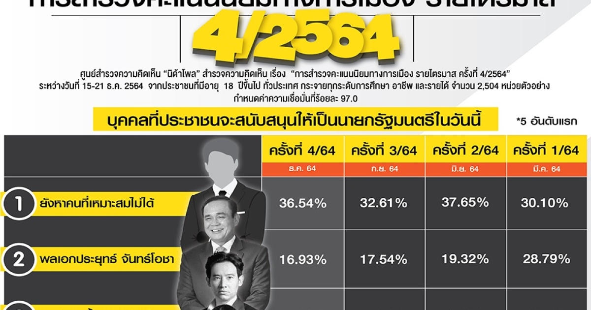 ศูนย์สำรวจความคิดเห็น “นิด้าโพล” สถาบันบัณฑิตพัฒนบริหารศาสตร์ (นิด้า) เปิดเผยผลสำรวจของประชาชน เรื่อง “การสำรวจคะแนนนิยมทางการเมือง รายไตรมาส ครั้งที่ 4/2564” ทำการสำรวจระหว่างวันที่ 15-21 ธันวาคม 2564 จากประชาชนที่มีอายุ 18 ปีขึ้นไป กระจายทุกภูมิภาค ระดับการศึกษา และอาชีพทั่วประเทศ รวมทั้งสิ้น จำนวน 2,504 หน่วยตัวอย่าง เกี่ยวกับการสำรวจคะแนนนิยมทางการเมือง การสำรวจอาศัยการสุ่มตัวอย่างโดยใช้ความน่าจะเป็นจากบัญชีรายชื่อฐานข้อมูลตัวอย่างหลัก (Master Sample) ของ “นิด้าโพล” สุ่มตัวอย่างด้วยวิธีแบบง่าย (Simple Random Sampling) เก็บข้อมูลด้วยวิธีการสัมภาษณ์ทางโทรศัพท์ โดยกำหนดค่าความเชื่อมั่นที่ร้อยละ 97.0