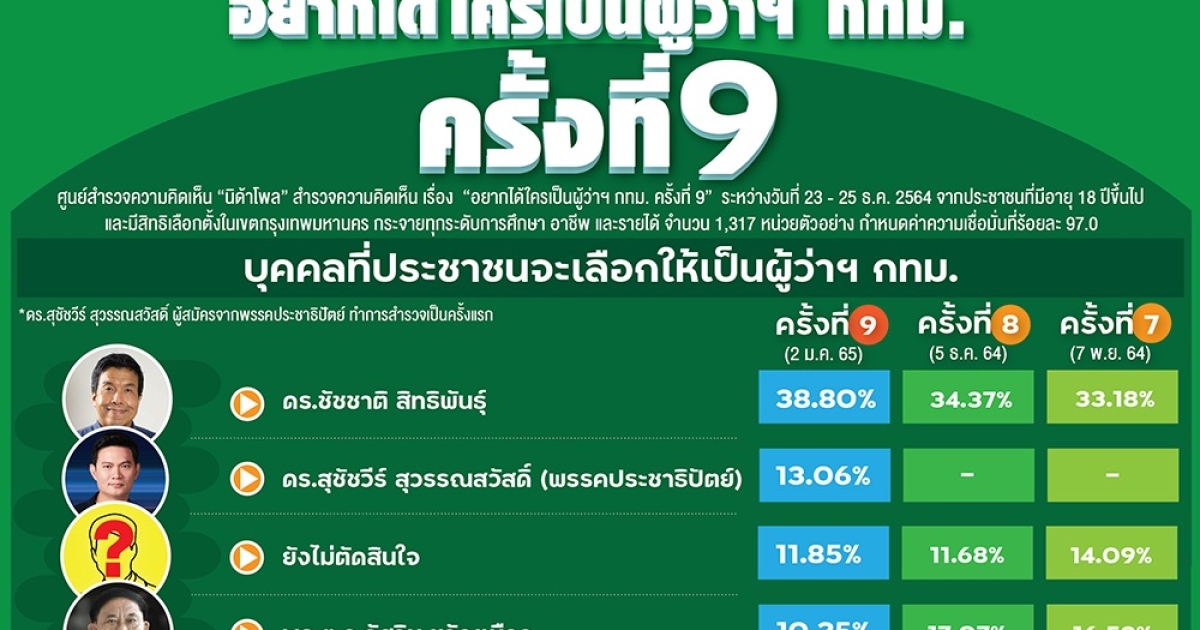 ศูนย์สำรวจความคิดเห็น “นิด้าโพล” สถาบันบัณฑิตพัฒนบริหารศาสตร์ (นิด้า) เปิดเผยผลสำรวจของประชาชน เรื่อง “อยากได้ใคร เป็นผู้ว่าฯ กทม. ครั้งที่ 9” ทำการสำรวจระหว่างวันที่ 23-25 ธันวาคม 2564 จากประชาชนที่มีอายุ 18 ปีขึ้นไป และมีสิทธิเลือกตั้งในกรุงเทพมหานคร กระจายทุกระดับการศึกษา อาชีพ และรายได้ รวมทั้งสิ้น จำนวน 1,317 หน่วยตัวอย่าง เกี่ยวกับประชาชนอยากได้ใครเป็นผู้ว่าฯ กทม. ครั้งที่ 9 การสำรวจอาศัยการสุ่มตัวอย่างโดยใช้ความน่าจะเป็นจากบัญชีรายชื่อฐานข้อมูลตัวอย่างหลัก (Master Sample) ของ “นิด้าโพล” สุ่มตัวอย่างด้วยวิธีแบบง่าย (Simple Random Sampling) เก็บข้อมูลด้วยวิธีการสัมภาษณ์ทางโทรศัพท์ โดยกำหนดค่าความเชื่อมั่นที่ ร้อยละ 97.0