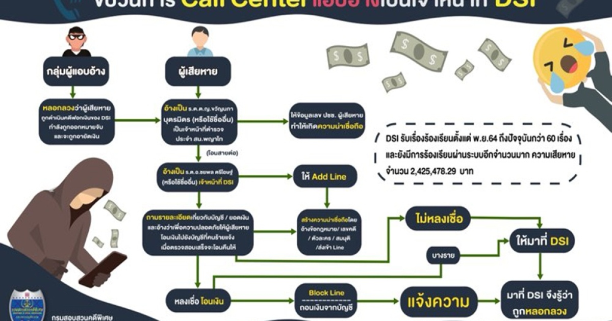 ตามที่นายไตรยฤทธิ์ เตมหิวงศ์ อธิบดีกรมสอบสวนคดีพิเศษ ได้ประชาสัมพันธ์แจ้งเตือนพี่น้องประชาชน กรณี มีแก๊ง CALL CENTER โทรศัพท์แอบอ้างเป็น DSI หรือกรมสอบสวนคดีพิเศษ หลอกลวง เอาเงินของผู้เสียหาย โดยอ้างว่ากำลังถูก DSI ดำเนินคดีอาญาฐานฟอกเงินและให้นำเงินไปเก็บไว้ในบัญชีของ ที่แจ้ง เพื่อตรวจสอบหากดำเนินการเสร็จแล้วจะโอนคืนให้ พร้อมทั้งหลอกลวงให้เดินทางมายังกรมสอบสวนคดีพิเศษเพื่อสอบปากคำอันเพิ่มความน่าเชื่อถือ สุดท้ายเชิดเงินหนี โดยอธิบดีกรมสอบสวนคดีพิเศษ ได้แนะนำวิธีการสังเกตและรับมือเรื่องดังกล่าวไปแล้ว แต่ปรากฏว่ายังมีพี่น้องประชาชนที่ยังตกเป็นเหยื่อของคนร้ายอย่างต่อเนื่อง โดยล่าสุด ในช่วงวันหยุดเทศกาลปีใหม่ รวมทั้งเมื่อวันที่ 8 - 9 มกราคมที่ผ่านมา ซึ่งเป็นวันหยุดราชการ ยังมีผู้เสียหายหลงเชื่อเดินทางมายังกรมสอบสวนคดีพิเศษ ตามคำหลอกลวงจำนวนหลายราย และบางรายมีการทำธุรกรรมโอนเงินให้กับคนร้ายต้องสูญเสียเงินเป็นจำนวนมาก