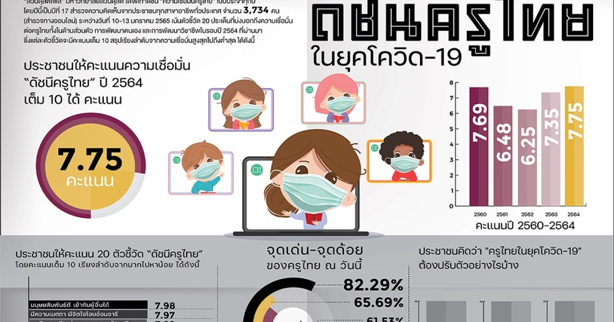 สวนดุสิตโพล มหาวิทยาลัยสวนดุสิต สำรวจความคิดเห็นของประชาชนเรื่อง “ดัชนีครูไทย ปี 2564 ครูไทยในยุคโควิด-19” กลุ่มตัวอย่าง 3,734 คน สำรวจวันที่ 10-13 มกราคม 2565 พบว่า ประชาชนให้คะแนนความเชื่อมั่น “ดัชนีครูไทย” ปี 2564 ดีขึ้นกว่าปีที่แล้ว ภาพรวมคะแนนเต็ม 10 ได้ 7.75 คะแนน โดยดัชนีที่ได้คะแนนมากที่สุด คือ มีมนุษยสัมพันธ์ดี เข้ากับผู้อื่นได้ 7.98 คะแนน ดัชนีที่ได้คะแนนน้อยที่สุด คือ ด้านการประหยัด ไม่ฟุ้งเฟ้อ ไม่เป็นหนี้เป็นสิน 6.75 คะแนน โดยประชาชนมองว่าจุดเด่นของครูไทย คือ การใช้เทคโนโลยี มีทักษะใหม่ ๆ มีเทคนิคการสอนที่ดี ร้อยละ 82.29 จุดด้อยคือ มีภาระงานมาก ไม่มีเวลา ร้อยละ 74.99 โดยครูไทยในยุคโควิด-19 ต้องปรับตัวด้านการสอนออนไลน์ให้น่าสนใจ ปรับรูปแบบการสอน ร้อยละ 85.38 รองลงมาคือ ใช้สื่อโซเชียลให้เป็นประโยชน์ พัฒนาด้านภาษาและเทคโนโลยี ร้อยละ 84.46