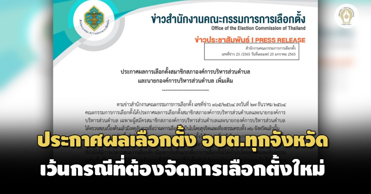 กกต.ประกาศผลการเลือกตั้งสมาชิก-นายก อบต.ทั้งหมด ชั้นตรวจสอบมีเหตุอันควรเชื่อได้ว่ามีการเลือกตั้งเป็นไปโดยสุจริตและเที่ยงธรรมแล้ว แต่ยกเว้นกรณีที่ต้องจัดการเลือกตั้งใหม่