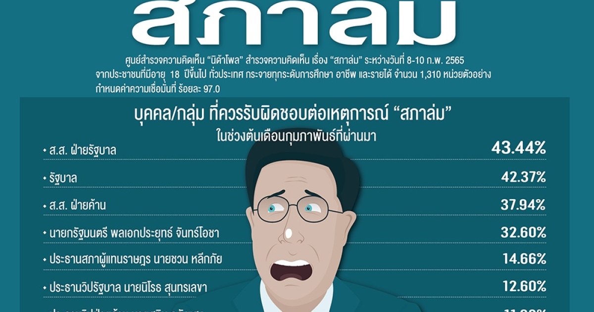 "...สถาบันบัณฑิตพัฒนบริหารศาสตร์ (นิด้า) เปิดเผยผลสำรวจของประชาชน เรื่อง “สภาล่ม” จากการสำรวจเมื่อถามถึงความคิดเห็นของประชาชนต่อบุคคล/กลุ่ม ที่ควรรับผิดชอบต่อเหตุการณ์ “สภาล่ม” ในช่วงต้นเดือนกุมภาพันธ์ที่ผ่านมา พบว่า ตัวอย่าง ร้อยละ 43.44 ระบุว่า ส.ส. ฝ่ายรัฐบาล รองลงมา ร้อยละ 42.37 ระบุว่า รัฐบาล ร้อยละ 37.94 ระบุว่า ส.ส. ฝ่ายค้าน..."
