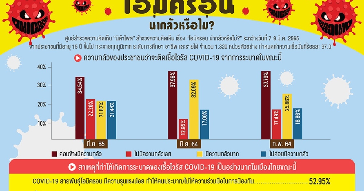 "...สถาบันบัณฑิตพัฒนบริหารศาสตร์ (นิด้า) เปิดเผยผลสำรวจของประชาชน เรื่อง “โอมิครอนน่ากลัวหรือไม่” จากการสำรวจเมื่อถามถึงความกลัวของประชาชนว่าจะติดเชื้อไวรัส COVID-19 จากการแพร่ระบาดในขณะนี้ พบว่า ตัวอย่าง ร้อยละ 34.54 ระบุว่า ค่อนข้างมีความกลัว เพราะ ผู้ติดเชื้อไวรัส COVID-19 มีจำนวนมากกว่าครั้งที่ผ่านมา จำเป็นต้องเดินทางไปทำงานนอกบ้าน ต้องติดต่อกับผู้คนจำนวนมาก และพักอาศัยอยู่ในพื้นที่เสี่ยงต่อการแพร่ระบาด..."