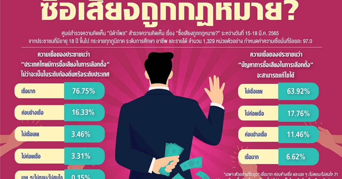 ศูนย์สำรวจความคิดเห็น “นิด้าโพล” สถาบันบัณฑิตพัฒนบริหารศาสตร์ (นิด้า) เปิดเผยผลสำรวจของประชาชน เรื่อง “ซื้อเสียงถูกกฎหมาย?” ทำการสำรวจระหว่างวันที่ 15-18 มีนาคม 2565 จากประชาชนที่มีอายุ 18 ปีขึ้นไป กระจายทุกภูมิภาค ระดับการศึกษา อาชีพและรายได้ ทั่วประเทศ รวมทั้งสิ้น จำนวน 1,329 หน่วยตัวอย่าง เกี่ยวกับการซื้อเสียงในการเลือกตั้ง การสำรวจอาศัยการสุ่มตัวอย่าง โดยใช้ความน่าจะเป็นจากบัญชีรายชื่อฐานข้อมูลตัวอย่างหลัก (Master Sample) ของ “นิด้าโพล” สุ่มตัวอย่างด้วยวิธีแบบง่าย (Simple Random Sampling) เก็บข้อมูลด้วยวิธีการสัมภาษณ์ทางโทรศัพท์ โดยกำหนดค่าความเชื่อมั่น ร้อยละ 97.0