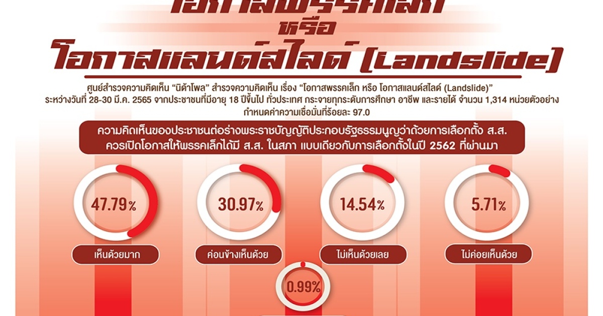ศูนย์สำรวจความคิดเห็น “นิด้าโพล” สถาบันบัณฑิตพัฒนบริหารศาสตร์ (นิด้า) เปิดเผยผลสำรวจของประชาชน เรื่อง “โอกาสพรรคเล็ก หรือโอกาสแลนด์สไลด์ (Landslide)” ทำการสำรวจระหว่างวันที่ 28-30 มีนาคม 2565 จากประชาชนที่มีอายุ 18 ปีขึ้นไป กระจายทุกภูมิภาคระดับการศึกษา อาชีพ และรายได้ ทั่วประเทศ รวมทั้งสิ้น จำนวน 1,314 หน่วยตัวอย่าง เกี่ยวกับร่างพระราชบัญญัติประกอบรัฐธรรมนูญว่าด้วยการเลือกตั้ง ส.ส. ในการให้โอกาสพรรคเล็กได้มี ส.ส. ในสภา หรือการเปิดโอกาสให้มีพรรคการเมืองชนะเลือกตั้งแบบแลนด์สไลด์ (Landslide) การสำรวจอาศัยการสุ่มตัวอย่าง โดยใช้ความน่าจะเป็นจากบัญชีรายชื่อฐานข้อมูลตัวอย่างหลัก (Master Sample) ของ “นิด้าโพล” สุ่มตัวอย่างด้วยวิธีแบบง่าย (Simple Random Sampling) เก็บข้อมูลด้วยวิธีการสัมภาษณ์ทางโทรศัพท์ โดยกำหนดค่าความเชื่อมั่น ร้อยละ 97.0