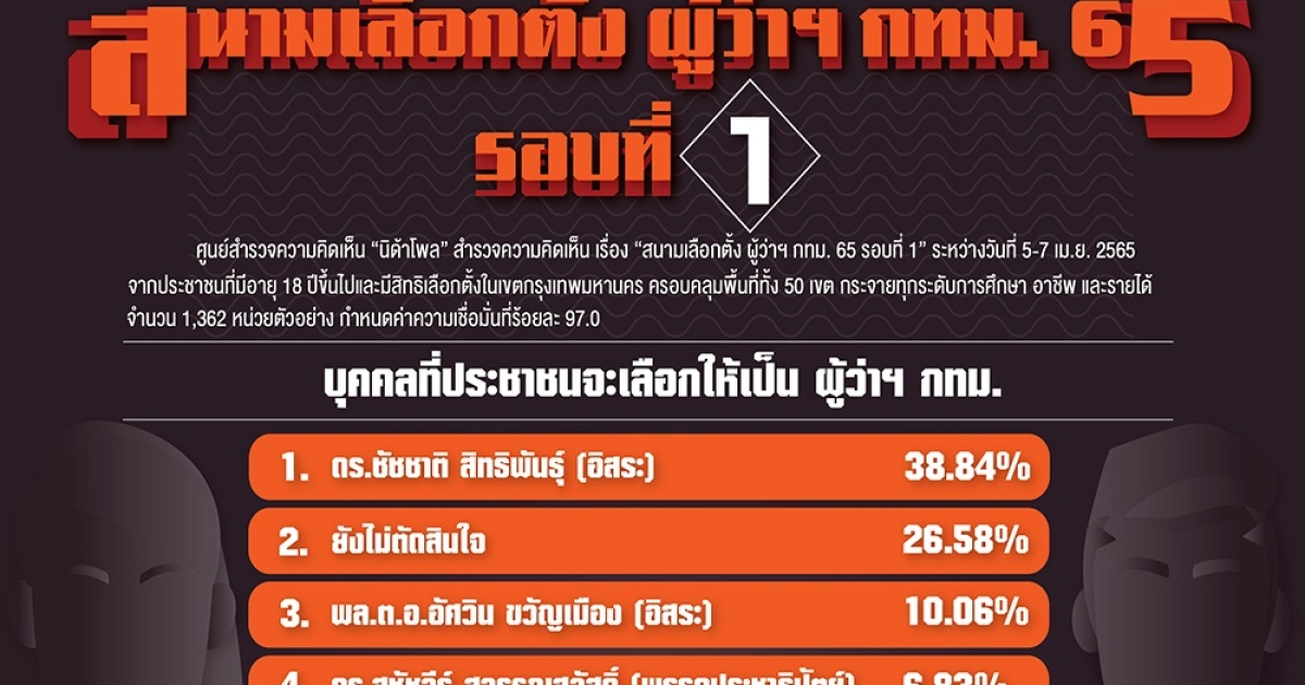 "...สถาบันบัณฑิตพัฒนบริหารศาสตร์ (นิด้า) เปิดเผยผลสำรวจของประชาชน เรื่อง “สนามเลือกตั้งผู้ว่าฯ กทม. 65 รอบที่ 1” จากการสำรวจเมื่อถามถึงบุคคลที่ประชาชนจะเลือกให้เป็นผู้ว่าฯ กทม. พบว่า อันดับ 1 ร้อยละ 38.84 ระบุว่าเป็น ดร.ชัชชาติ สิทธิพันธุ์ (อิสระ) เพราะ เป็นคนเก่ง มีความสามารถ มีวิสัยทัศน์ ตั้งใจในการทำงาน และลงพื้นที่รับฟังปัญหาของประชาชน อันดับ 2 ร้อยละ 26.58 ระบุว่า ยังไม่ตัดสินใจ อันดับ 3 ร้อยละ 10.06 ระบุว่าเป็น พล.ต.อ.อัศวิน ขวัญเมือง (อิสระ) เพราะ เป็นคนมีประสบการณ์ บริหารงานเก่ง และสามารถสานต่องานได้อย่างต่อเนื่อง..."