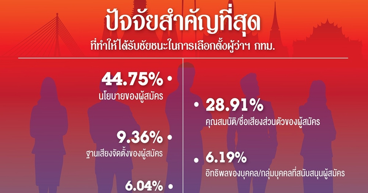 "...สถาบันบัณฑิตพัฒนบริหารศาสตร์ (นิด้า) เปิดเผยผลสำรวจของประชาชน เรื่อง “ปัจจัยในการชนะการเลือกตั้งผู้ว่าฯ กทม.” จากการสำรวจเมื่อถามความคิดเห็นของประชาชนถึงปัจจัยสำคัญที่สุดที่ทำให้ได้รับชัยชนะในการเลือกตั้งผู้ว่า กทม. พบว่า ตัวอย่าง ร้อยละ 44.75 ระบุว่า นโยบายของผู้สมัคร รองลงมา ร้อยละ 28.91 ระบุว่า คุณสมบัติ/ชื่อเสียงส่วนตัวของผู้สมัคร..."