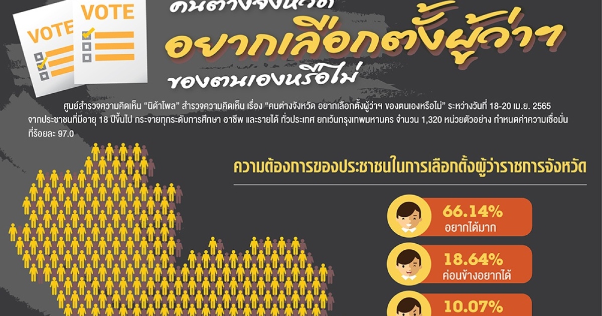 ศูนย์สำรวจความคิดเห็น “นิด้าโพล” สถาบันบัณฑิตพัฒนบริหารศาสตร์ (นิด้า) เปิดเผยผลสำรวจของประชาชน เรื่อง “คนต่างจังหวัด อยากเลือกตั้งผู้ว่าฯ ของตนเองหรือไม่” ทำการสำรวจระหว่างวันที่ 18-20 เมษายน 2565 จากประชาชนที่มีอายุ 18 ปีขึ้นไป กระจายทุกระดับการศึกษา อาชีพ และรายได้ ทั่วประเทศ ยกเว้นกรุงเทพมหานคร รวมทั้งสิ้น จำนวน 1,320 หน่วยตัวอย่าง เกี่ยวกับคนต่างจังหวัด อยากเลือกตั้งผู้ว่าฯ ของตนเองหรือไม่ การสำรวจอาศัยการสุ่มตัวอย่าง โดยใช้ความน่าจะเป็นจากบัญชีรายชื่อฐานข้อมูลตัวอย่างหลัก (Master Sample) ของ “นิด้าโพล” สุ่มตัวอย่างด้วยวิธีแบบง่าย (Simple Random Sampling) เก็บข้อมูลด้วยวิธีการสัมภาษณ์ทางโทรศัพท์ โดยกำหนดค่าความเชื่อมั่น ร้อยละ 97.0