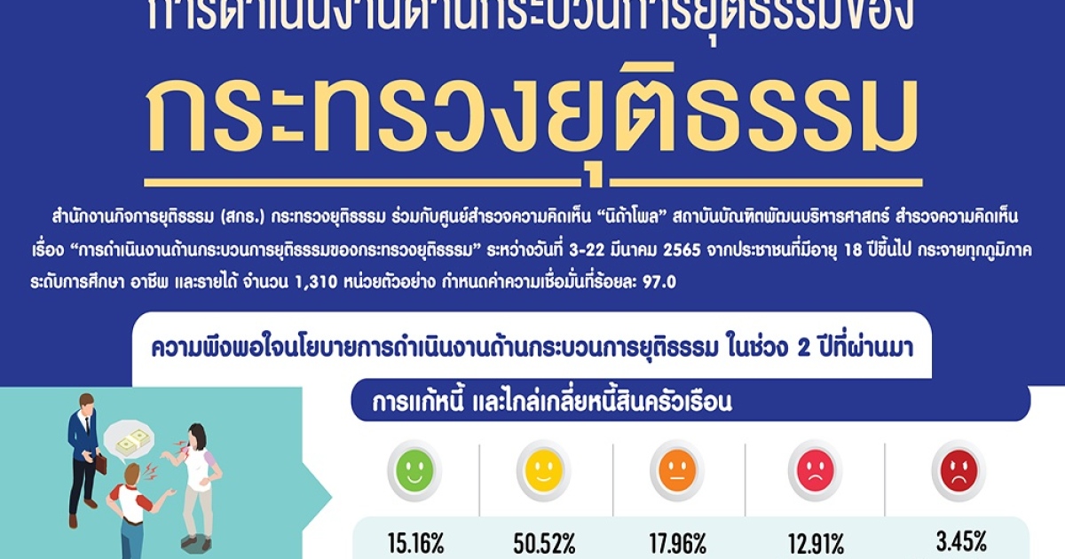 "...นิด้าโพลเปิดเผยผลสำรวจความคิดเห็นของประชาชน เรื่อง “การดำเนินงานด้านกระบวนการยุติธรรมของกระทรวงยุติธรรม” จากการสำรวจเมื่อถามถึงความพึงพอใจต่อนโยบายการดำเนินงานด้านกระบวนการยุติธรรมของกระทรวงยุติธรรม ในช่วง 2 ปีที่ผ่านมา พบว่า 1) การแก้หนี้และไกล่เกลี่ยหนี้สินครัวเรือน ตัวอย่างมีความพึงพอใจต่อการดำเนินงานตามนโยบาย อยู่ในระดับพอใจ – พอใจมาก 65.68..."