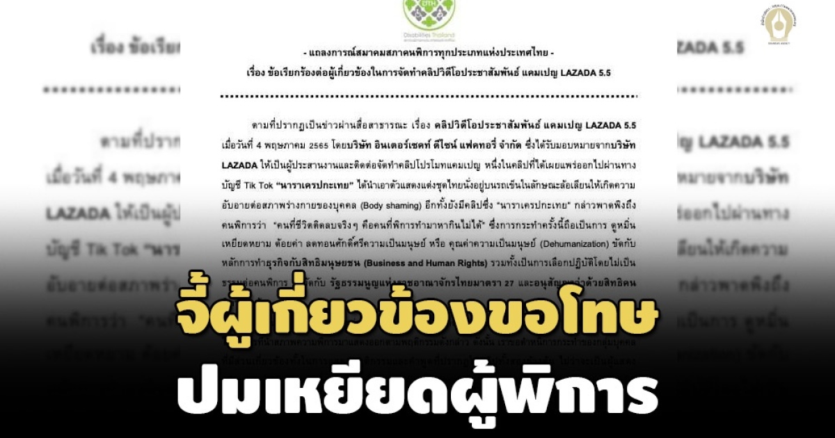 สมาคมสภาคนพิการทุกประเภทแห่งประเทศไทย ออกแถลงการณ์จี้ผู้เกี่ยวข้องแคมเปญ LAZADA 5.5 ขอโทษอย่างเป็นทางการโดยไร้เงื่อนไข ชี้เนื้อหาส่อดูหมิ่นเหยียดหยาม ด้อยค่า ลดทอนศักดิ์ศรี