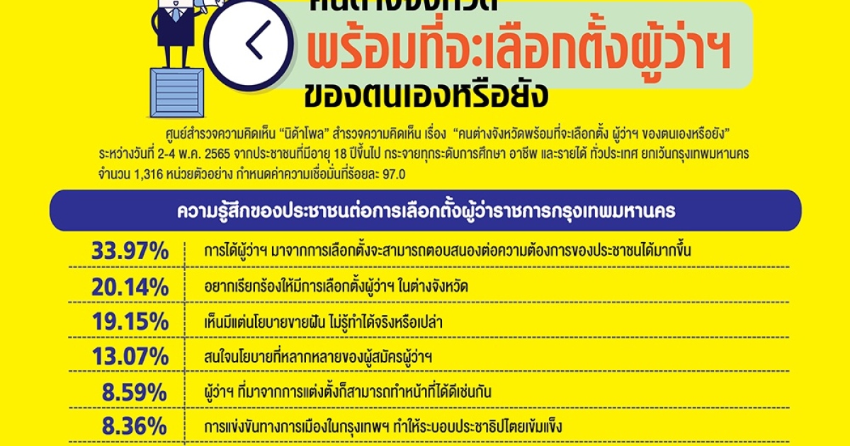 "...สถาบันบัณฑิตพัฒนบริหารศาสตร์ (นิด้า) เปิดเผยผลสำรวจของประชาชน เรื่อง “คนต่างจังหวัด พร้อมที่จะเลือกตั้งผู้ว่าฯ ของตนเองหรือยัง” เมื่อถามถึงความพร้อมของประชาชนที่จะมีผู้ว่าราชการจังหวัดมาจากการเลือกตั้ง พบว่า ตัวอย่าง ร้อยละ 47.87 ระบุว่า พร้อมมาก รองลงมา ร้อยละ 28.80 ระบุว่า ค่อนข้างพร้อม ร้อยละ 11.25 ระบุว่า ไม่พร้อมเลย ร้อยละ 10.56 ระบุว่า ไม่ค่อยพร้อม และร้อยละ 1.52 ระบุว่า เฉย ๆ อย่างไรก็ได้..."
