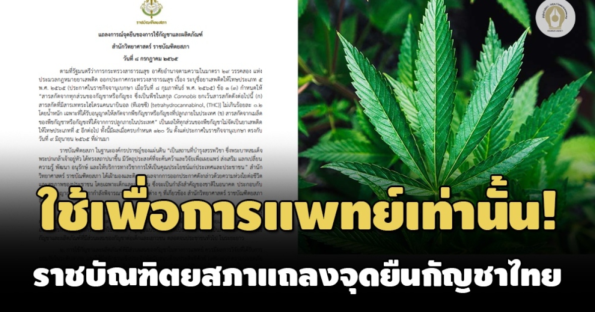 สำนักวิทย์ฯ ราชบัณฑิตยสภา ออกแถลง 3 ข้อแสดงจุดยืนใช้กัญชาและผลิตภัณฑ์ที่เกี่ยวข้อง ชี้รัฐต้องเข้าไปควบคุมให้ใช้ได้เฉพาะวัตถุประสงค์ทางการแพทย์เท่านั้น ห้ามใช้สันทนาการ ต้องควบคุมอย่าให้มีผลข้างเคียงส่งผลต่อประเทศชาติ