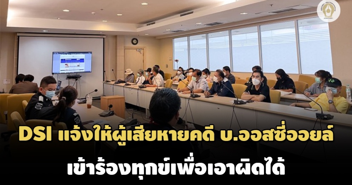 ดีเอสไอแจ้งประชาสัมพันธ์ให้ผู้เสียหาย ถูก บ.ออสซี่ออยล์ เอ็นเนอร์ยี่ หลอกลงทุน ตู้น้ำมันหยอดเหรียญ โรงไฟฟ้าชุมชน เข้าร้องทุกข์กล่าวโทษเอาผิดได้ หลังอธิบดีสั่งสอบพบพฤติการณ์ซับซ้อน รับเป็นคดีพิเศษแล้ว