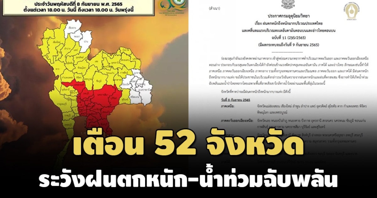 ผู้สื่อข่าวรายงานว่า เมื่อวันที่ 9 ก.ย. 2565 กรมอุตุนิยมวิทยา ออกประกาศ เรื่อง ฝนตกหนักถึงหนักมากบริเวณประเทศไทย และคลื่นลมแรงบริเวณทะเลอันดามันตอนบนและอ่าวไทยตอนบน(มีผลกระทบจนถึงวันที่ 9 ก.ย. 2565) ฉบับที่ 11 ลงวันที่ 8 ก.ย. 2565 ระบุว่า