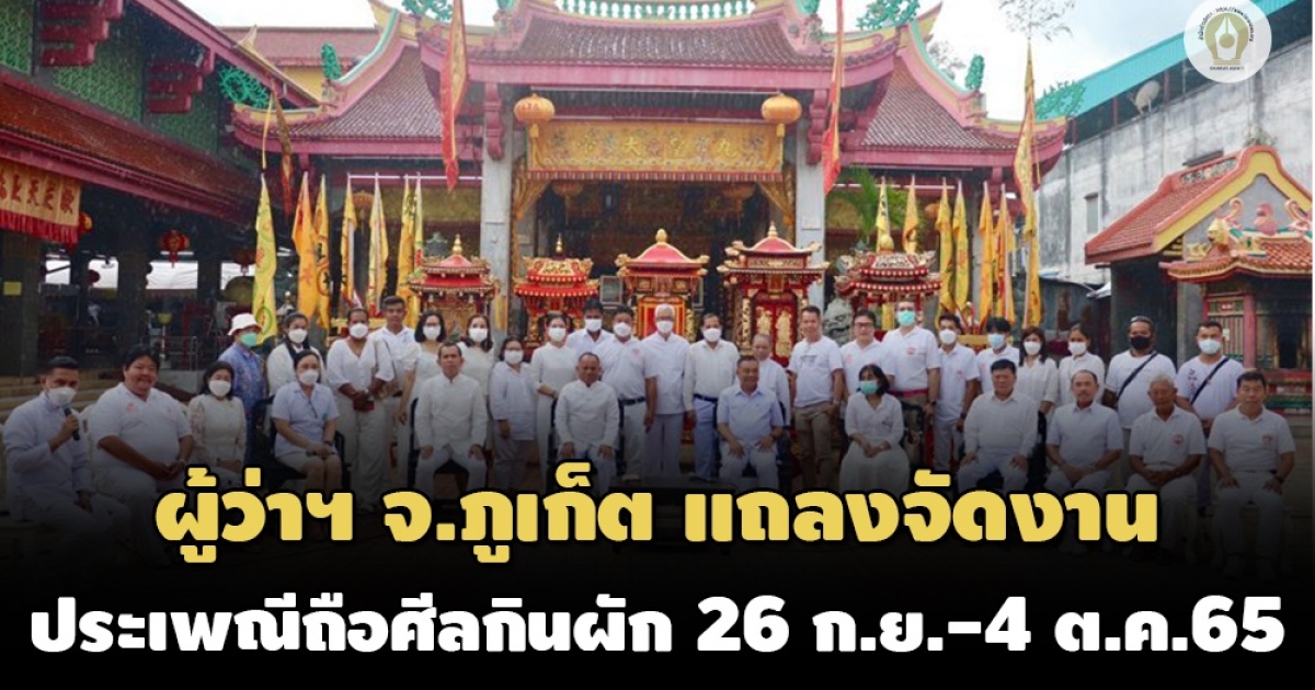 ผู้ว่าราชการจังหวัดภูเก็ต แถลงเปิดเทศกาลประเพณีถือศีลกินผักจังหวัดภูเก็ต ประจำปี 2565 ระหว่างวันที่ 26 กันยายน 2565 - 4 ตุลาคม 2565 เพื่อสืบทอดวัฒนธรรมประเพณีและภูมิปัญญาของชาติ
