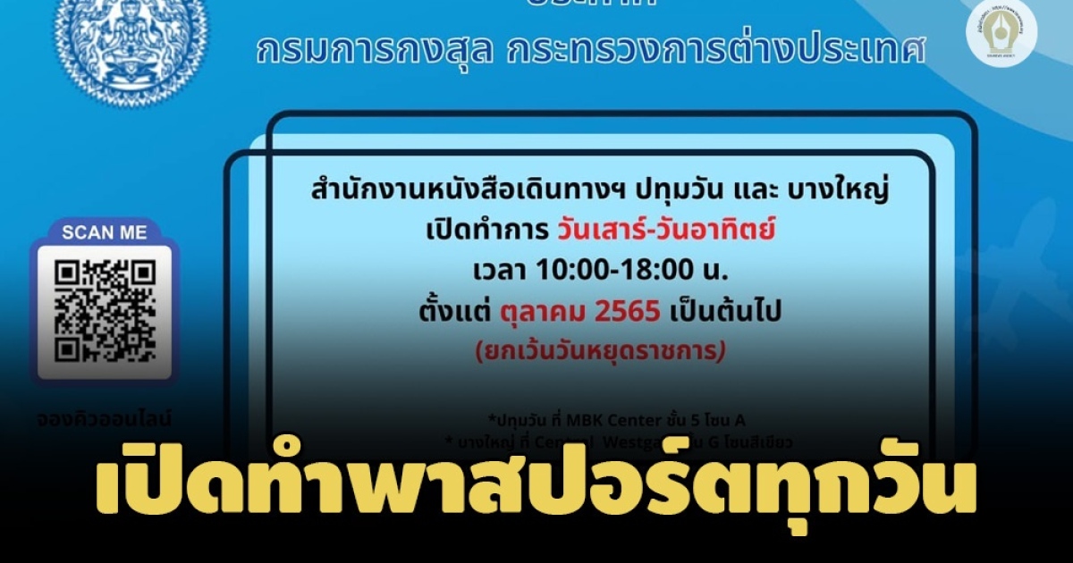 กรมการกงสุล กระทรวงการต่างประเทศ เปิดให้บริการทำหนังสือเดินทาง 7 วัน ที่ MBK Center และเซ็นทรัล เวสต์เกต ยกเว้นวันหยุดยาว เนื่องในวันหยุดราชการ ตั้งแต่ 1 ต.ค.เป็นต้นไป