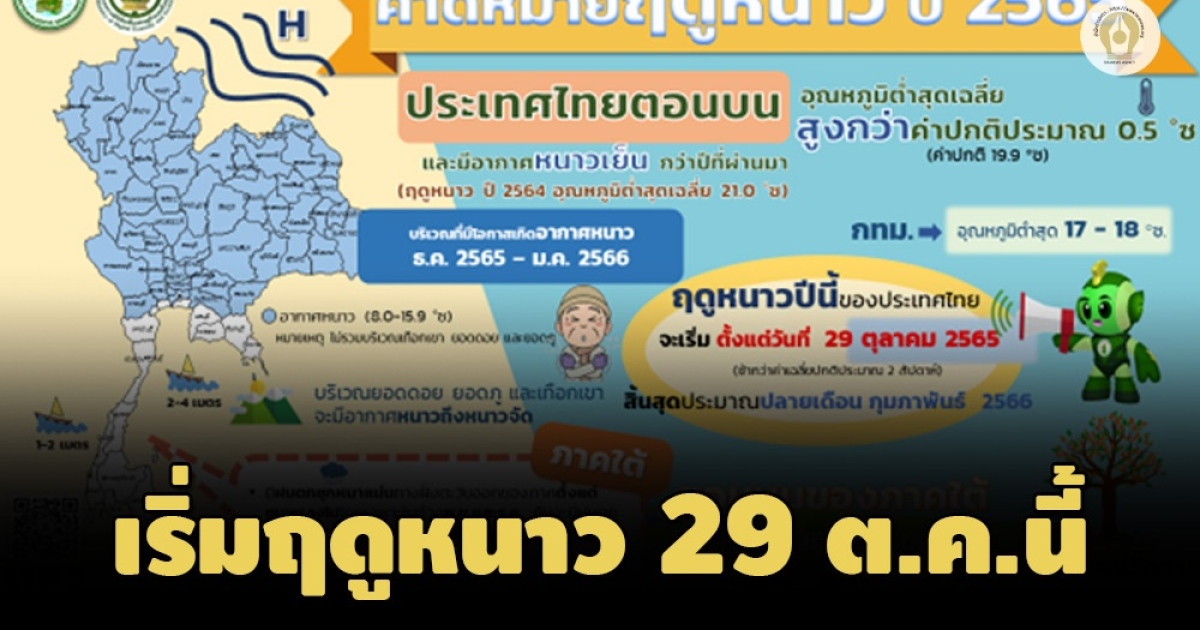สำนักข่าวอิศรา (www.isranews.org) วันทที่ 28 ต.ค.2565 - กรมอุตุนิยมวิทยา เผยแพร่ประกาศเริ่มต้นฤดูหนาว ปีนี้ ประเทศไทยจะเข้าสู่เข้าสู่ฤดูหนาว ตั้งแต่วันที่ 29 ตุลาคม พ.ศ. 2565 เป็นต้นไป โดยอุณหภูมิต่ำสุดบริเวณประเทศไทยตอนบนจะลดลงต่ำกว่า 23 องศาเซลเซียส ซึ่งอยู่ในเกณฑ์อากาศเย็นเกือบทั่วไปอย่างต่อเนื่อง และทิศทางลมที่พัดปกคลุมบริเวณประเทศไทยที่ระดับความสูง 100 เมตร ถึงความสูง 3,500 เมตร เปลี่ยนเป็นลมตะวันออกเฉียงเหนือหรือลมตะวันออก ส่วนลมระดับบนที่ความสูงตั้งแต่ 5,000 เมตรขึ้นไป เปลี่ยนเป็นลมฝ่ายตะวันตก ประกอบกับปริมาณและการกระจายของฝนบริเวณประเทศไทยตอนบนลดลงอย่างต่อเนื่อง อย่างไรก็ตามช่วงเริ่มต้นของฤดูหนาวในปีนี้ บริเวณประเทศไทยตอนบนจะมีฝนตกในบางช่วง ส่วนบริเวณภาคใต้จะมีฝนตกชุกหนาแน่นต่อไป