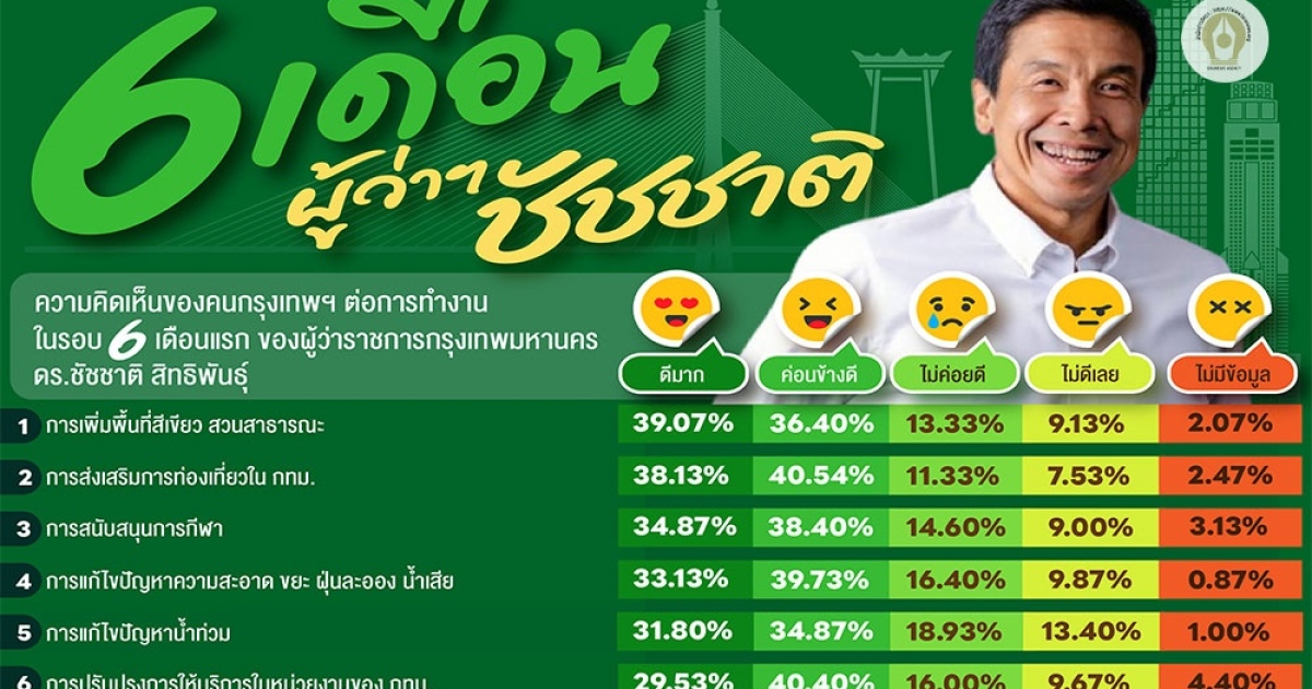 นิด้าโพลเผยความคิดเห็นประชาชนในกทม.ต่อการทำงาน 6 เดือนของผู้ว่าฯ ชัชาติ เพิ่มพื้นที่สีเขียวได้ดีมาก 39.07% ส่งเสริมการท่องเที่ยวได้ดีมาก 38.13% สนับสนุนการกีฬาได้ดีมาก 34.87%