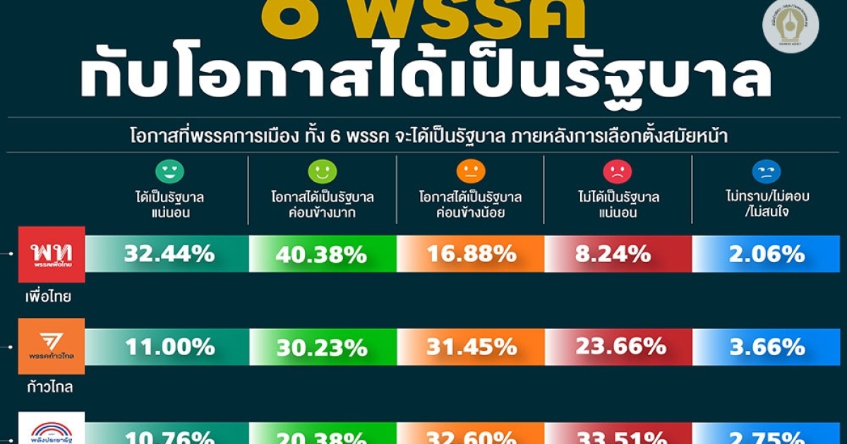 จากการสำรวจเมื่อให้ประชาชนวิเคราะห์ถึงโอกาสที่พรรคการเมือง ทั้ง 6 พรรค ซึ่งกำลังมีกระแสข่าวการไหลเข้า-ออก ของนักการเมืองจะได้เป็นรัฐบาล ภายหลังการเลือกตั้งสมัยหน้า พบว่า