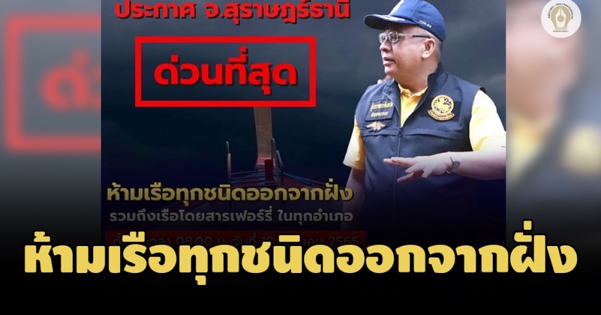 ผู้ว่าฯ สุราษฎร์ ประกาศ ห้ามเรือทุกชนิดออกจากฝั่งรวมถึงเรือเฟอร์รี่ตั้งแต่ 08.00 น. วันที่ 18 - 19 ธ.ค. 2565