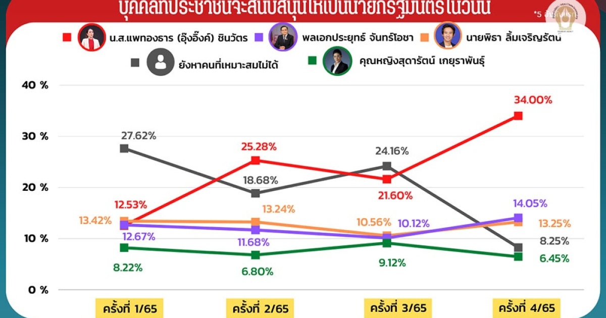 นิด้าโพลเผยผลสำรวจครั้งที่ 4 ชี้ประชาชนจะสนับสนุน 'อุ๊งอิ๊งค์' เป็นนายก 34% ทิ้งห่าง 'ประยุทธ์' กับ 'พิธา' ที่มีคนเลือก 14.05% และ 13.25%