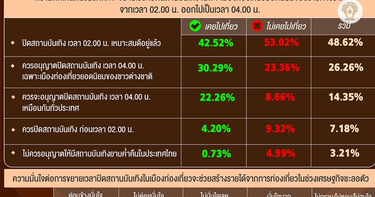 เมื่อพิจารณาเฉพาะความคิดเห็นของผู้ที่เคยไปสถานบันเทิง (จำนวน 548 หน่วยตัวอย่าง) เกี่ยวกับแนวคิดที่จะขยายเวลาปิดสถานบันเทิง เฉพาะเมืองท่องเที่ยวยอดนิยมของชาวต่างชาติ พบว่า ร้อยละ 42.52 ระบุว่า ปิดสถานบันเทิง เวลา 02.00 น. เหมาะสมดีอยู่แล้ว รองลงมา ร้อยละ 30.29 ระบุว่า ควรอนุญาตปิดสถานบันเทิง เวลา 04.00 น. เฉพาะเมืองท่องเที่ยวยอดนิยมของชาวต่างชาติ ร้อยละ 22.26 ระบุว่า ควรจะอนุญาตปิดสถานบันเทิง เวลา 04.00 น. เหมือนกันทั่วประเทศ ร้อยละ 4.20 ระบุว่า ควรปิดสถานบันเทิง ก่อนเวลา 02.00 น. และร้อยละ 0.73 ระบุว่า ไม่ควรอนุญาตให้มีสถานบันเทิงยามค่ำคืนในประเทศไทย ส่วนความคิดเห็นของผู้ที่ไม่เคยไปสถานบันเทิง (จำนวน 762 หน่วยตัวอย่าง) พบว่า ร้อยละ 53.02 ระบุว่า ปิดสถานบันเทิง เวลา 02.00 น. เหมาะสมดีอยู่แล้ว รองลงมา ร้อยละ 23.36 ระบุว่า ควรอนุญาตปิดสถานบันเทิง เวลา 04.00 น. เฉพาะเมืองท่องเที่ยวยอดนิยมของชาวต่างชาติ ร้อยละ 9.32 ระบุว่า ควรปิดสถานบันเทิง ก่อนเวลา 02.00 น. ร้อยละ 8.66 ระบุว่า ควรจะอนุญาตปิดสถานบันเทิง เวลา 04.00 น. เหมือนกันทั่วประเทศ ร้อยละ 4.99 ระบุว่า ไม่ควรอนุญาตให้มีสถานบันเทิงยามค่ำคืนในประเทศไทย และร้อยละ 0.65 ระบุว่า ไม่ทราบ/ไม่ตอบ/ไม่แน่ใจ