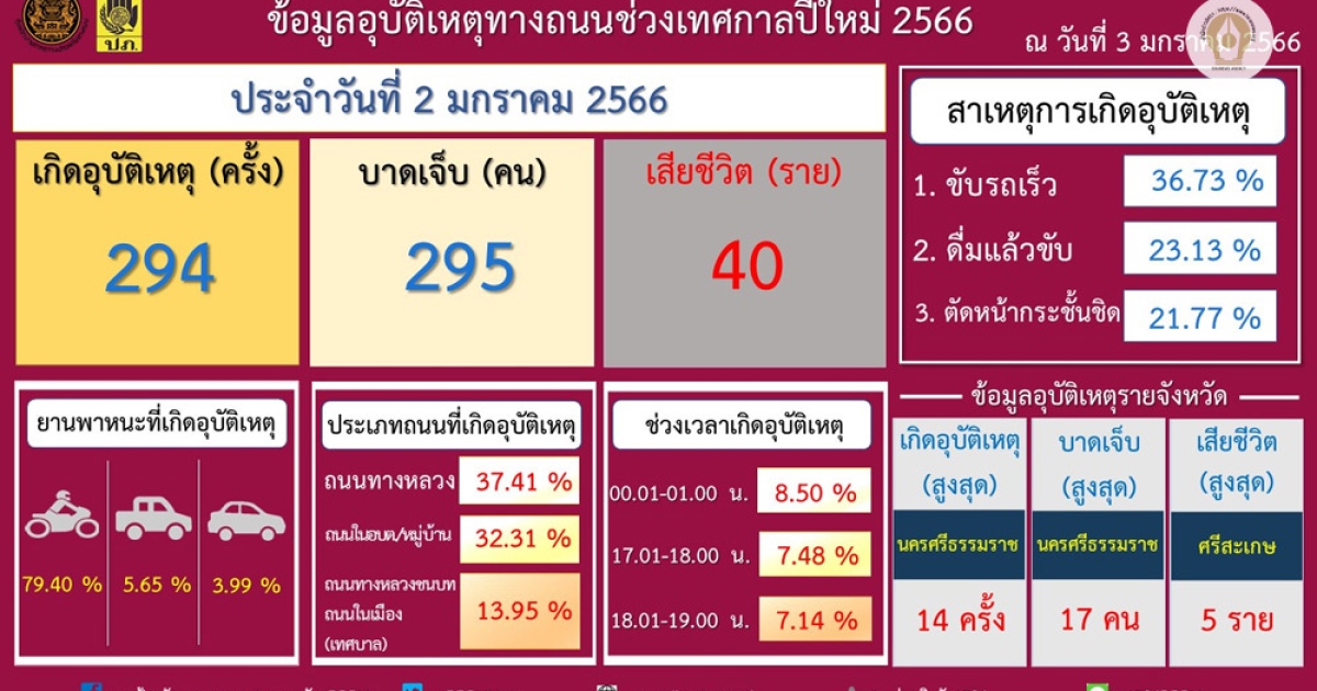7 วันอันตรายปีใหม่ วันที่ 5 เกิดอุบัติเหตุ 294 ครั้ง ดับอีก 40 ราย บาดเจ็บ 295 ราย สาเหตุขับรถเร็ว - เมาแล้วขับ รวมสียชีวิต 263 ราย บาดเจ็บ 1,938 ราย