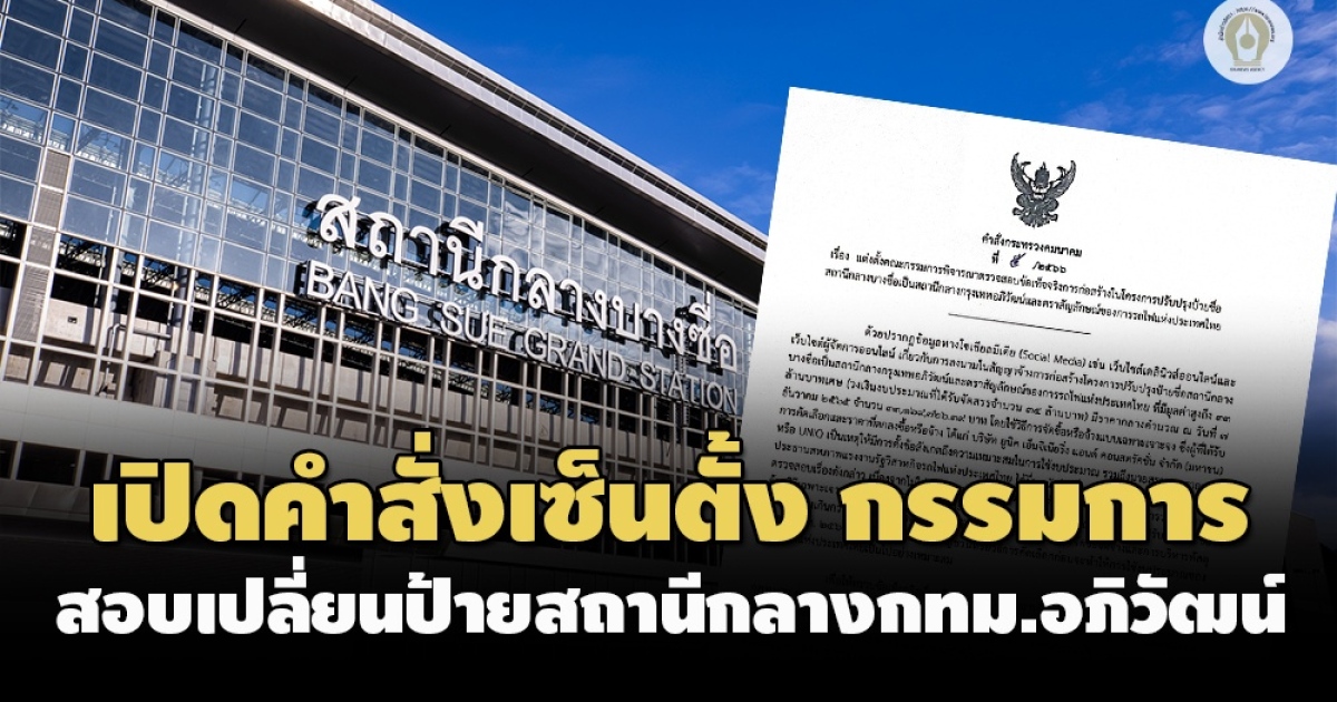 สำนักข่าวอิศรา (www.isranews.org) รายงานว่า วันที่ 4 มกราคม 2566 นายศักดิ์สยาม ชิดชอบ รัฐมนตรีว่าการกระทรวงคมนาคม ลงนามในคำสั่งกระทรวงคมนาคมที่ 5/2566 เรื่อง แต่งตั้งคณะกรรมการพิจารณาตรวจสอบข้อเท็จจริงการก่อสร้างในโครงการปรับปรุงป้ายชื่อสถานีกลางบางชื่อเป็นสถานีกลางกรุงเทพอภิวัฒน์และตราสัญลักษณ์ของการรถไฟแห่งประเทศไทย สาระสำคัญ มีดังนี้