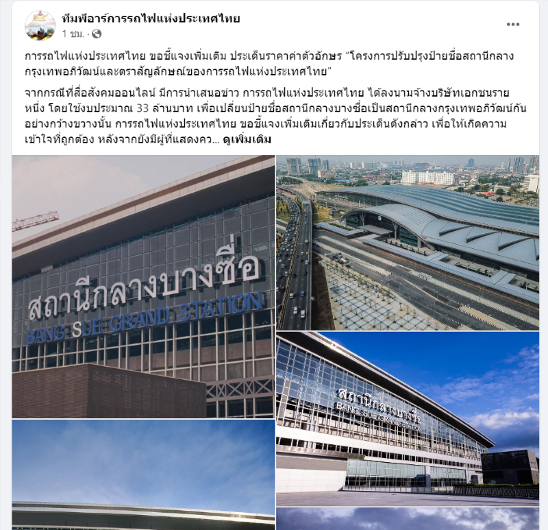 จากกรณีที่สื่อสังคมออนไลน์ มีการนำเสนอข่าว การรถไฟแห่งประเทศไทย ได้ลงนามจ้างบริษัทเอกชนรายหนึ่ง โดยใช้งบประมาณ 33 ล้านบาท เพื่อเปลี่ยนป้ายชื่อสถานีกลางบางซื่อเป็นสถานีกลางกรุงเทพอภิวัฒน์กันอย่างกว้างขวางนั้น การรถไฟแห่งประเทศไทย ขอชี้แจงเพิ่มเติมเกี่ยวกับประเด็นดังกล่าว เพื่อให้เกิดความเข้าใจที่ถูกต้อง หลังจากยังมีผู้ที่แสดงความคิดเห็นผ่านสื่อโซเชียลมีเดียคลาดเคลื่อนจากข้อเท็จจริงในหลายประเด็น ดังนี้