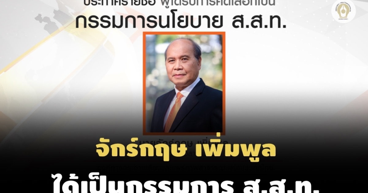 ส.ส.ท. ประกาศ นายจักร์กฤษ เพิ่มพูล เป็นผู้ผ่านการคัดเลือกตำแหน่งกรรมการนโยบาย ด้านกิจการสื่อสารมวลชน