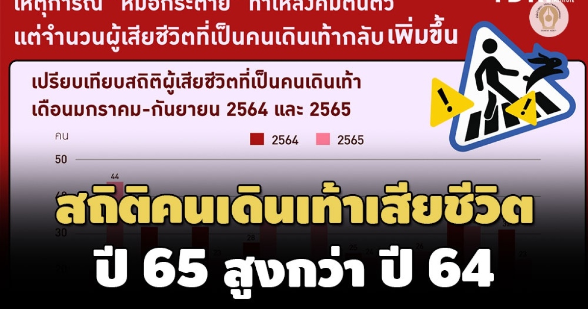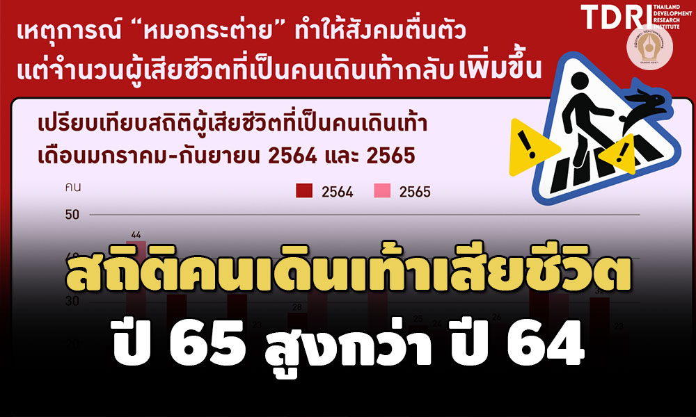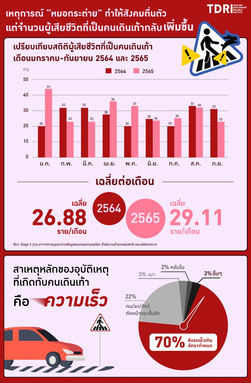 สถาบันวิจัยเพื่อการพัฒนาประเทศไทยเผย สถิติจำนวนคนเดินเท้าที่เสียชีวิตในปี 2565 เฉลี่ย 29 ราย/เดือน สูงกว่าปี 2564 สาเหตุหลักคือขับรถเร็วเกินอัตราที่กำหนด