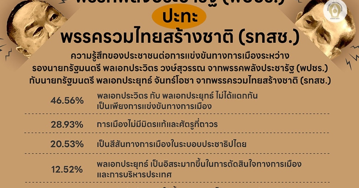 ตัวอย่าง ร้อยละ 46.56 ระบุว่า พลเอกประวิตร กับ พลเอกประยุทธ์ ไม่ได้แตกกัน เป็นเพียงแค่การแข่งขันทางการเมือง