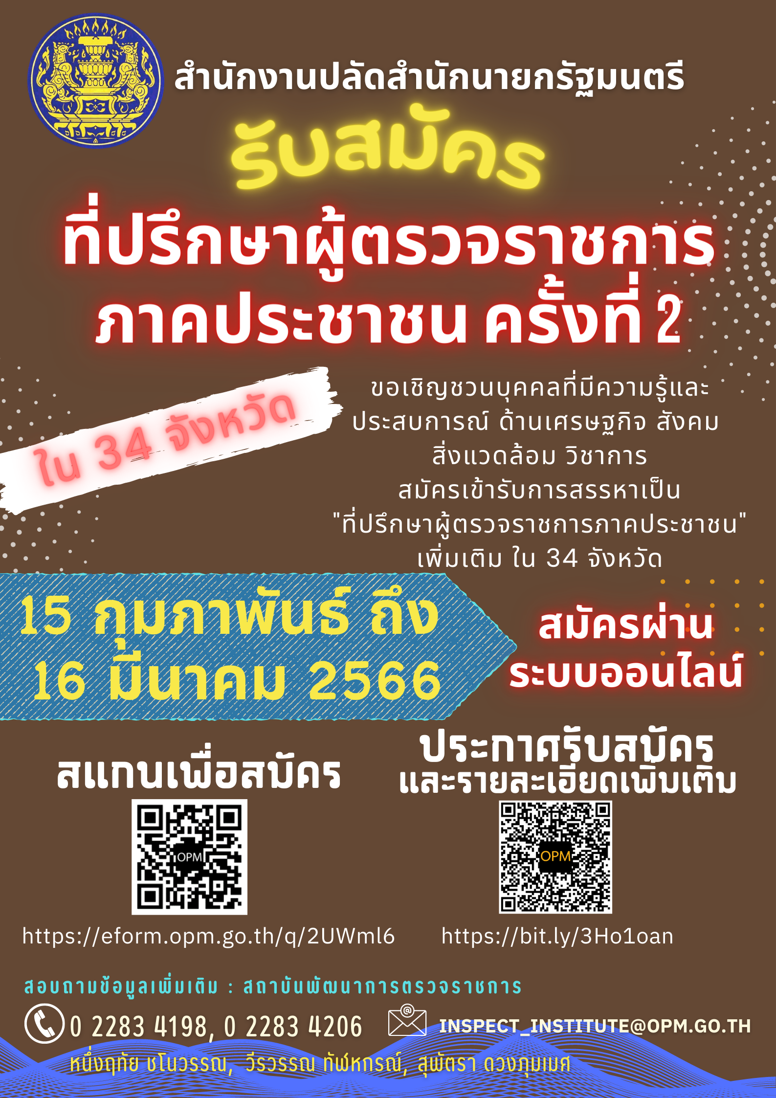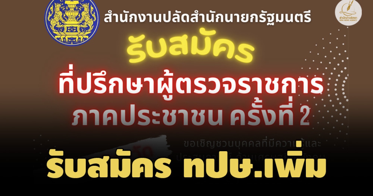 สำนักงานปลัดสำนักนายกรัฐมนตรี รับสมัคร ที่ปรึกษาผู้ตรวจราชการภาคประชาชน ครั้งที่ 2 เพิ่มเติมใน 34 จังหวัด ตั้งแต่วันที่ 15 ก.พ. - 16 มี.ค.2566