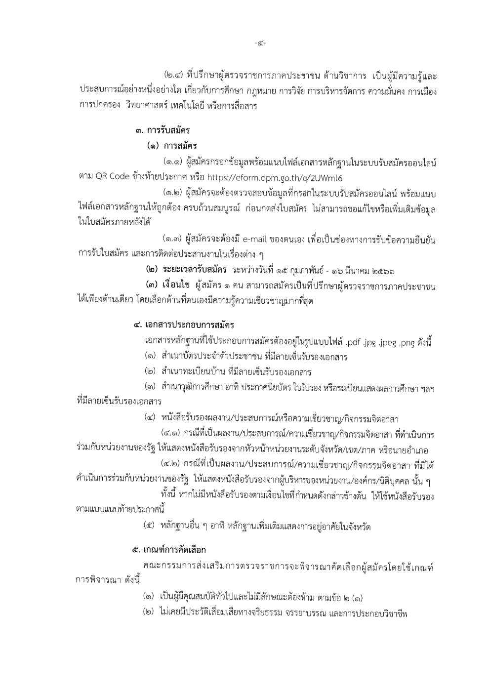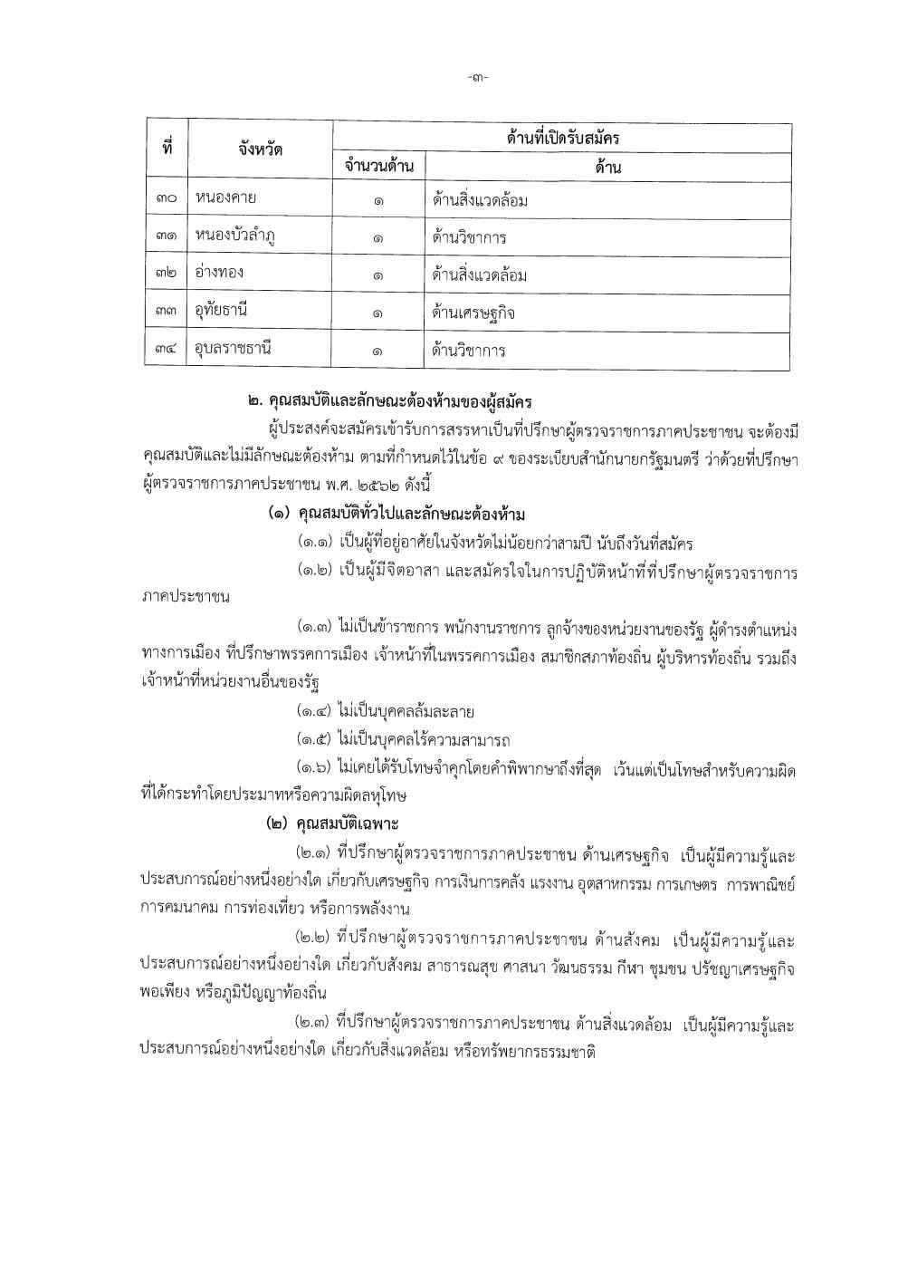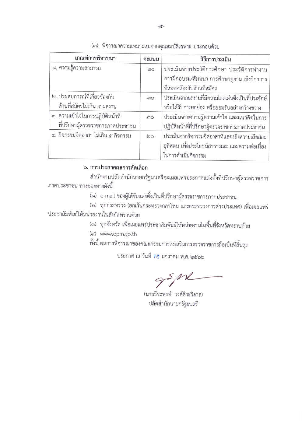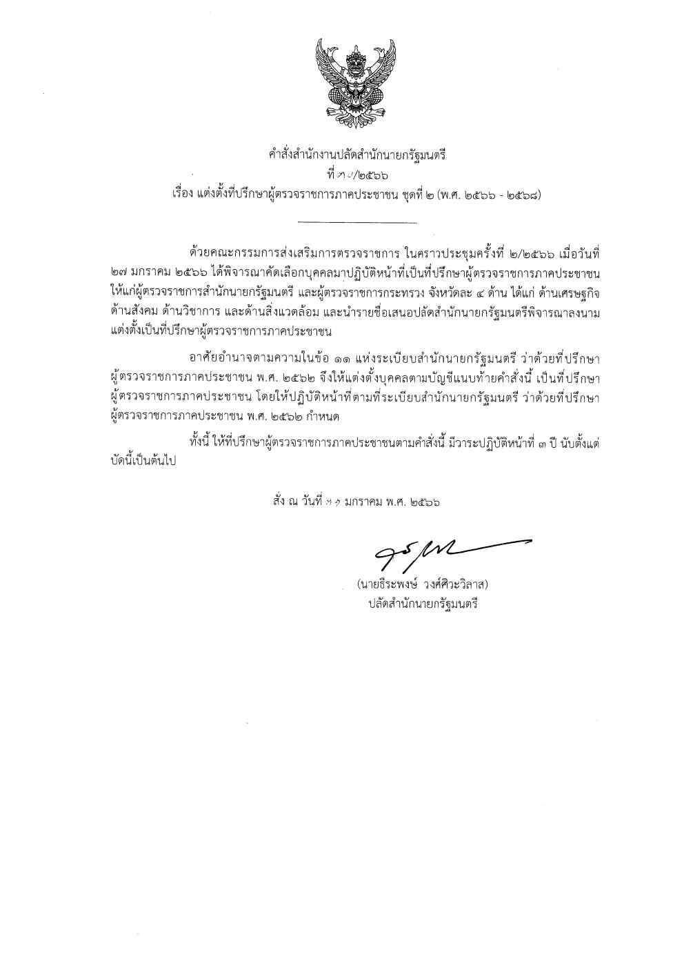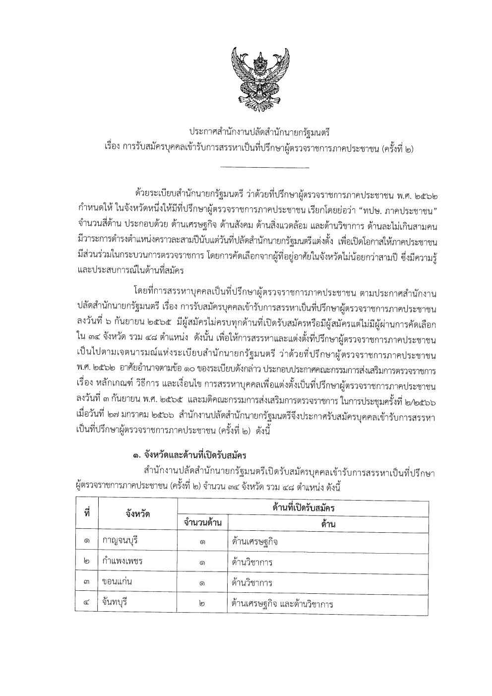 โดยที่การสรรหาบุคคลเป็นที่ปรึกษาผู้ตรวจราชการภาคประชาชน ตามประกาศสำนักงานปลัดสำนักนายกรัฐมนตรี เรื่อง การรับสมัครบุคคลเข้ารับการสรรหาเป็นที่ปรึกษาผู้ตรวจราชการภาคประชาชน ลงวันที่ 6 กันยายน 2565 มีผู้สมัครไม่ครบทุกด้านที่เปิดรับสมัครหรือมีผู้สมัครแต่ไม่มีผู้ผ่านการคัดเลือก ใน 34 จังหวัด รวม 48 ตำแหน่ง ง ดังนั้น เพื่อให้การสรรหาและแต่งตั้งที่ปรึกษาผู้ตรวจราชการภาคประชาชนเป็นไปตามเจตนารมณ์แห่งระเบียบสำนักนายกรัฐมนตรี ว่าด้วยที่ปรึกษาผู้ตรวจราชการภาคประชาชน พ.ศ. 2562 อาศัยอำนาจตามข้อ 1 ของระเบียบดังกล่าว ประกอบประกาศคณะกรรมการส่งเสริมการตรวจราชการ เรื่อง หลักเกณฑ์ วิธีการ และเงื่อนไข การสรรหาบุคคลเพื่อแต่งตั้งเป็นที่ปรึกษาผู้ตรวจราชการภาคประชาชน ลงวันที่ 3 กันยายน พ.ศ. 2565 และมติคณะกรรมการส่งเสริมการตรวจราชการ ในการประชุมครั้งที่ 2/2566 วันที่ 27 มกราคม 2566 สำนักงานปลัดสำนักนายกรัฐมนตรีจึงประกาศรับสมัครบุคคลเข้ารับเป็นที่ปรึกษาผู้ตรวจราชการภาคประชาชน (ครั้งที่ 2)