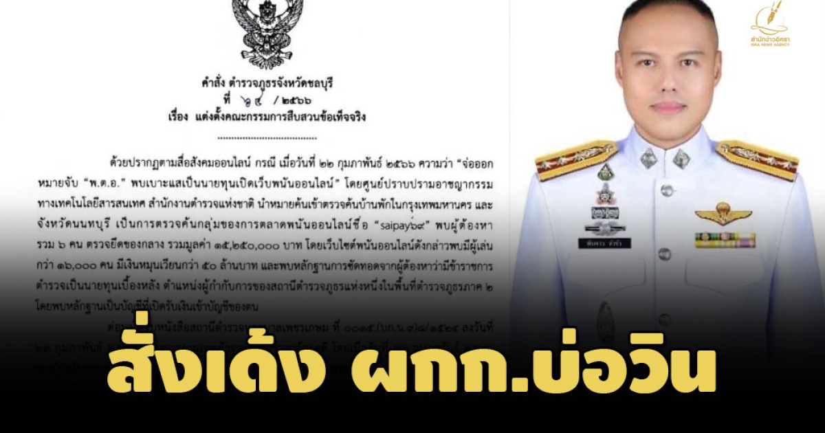 กองบังคับการตำรวจภูธรชลบุรี สั่งเด้งแล้ว ผกก.บ่อวิน เอี่ยวเว็บพนัน Saipay 69 โดยขาดจากตำแหน่งเดิม พร้อมตั้งคณะกรรมการสอบข้อเท็จจริง