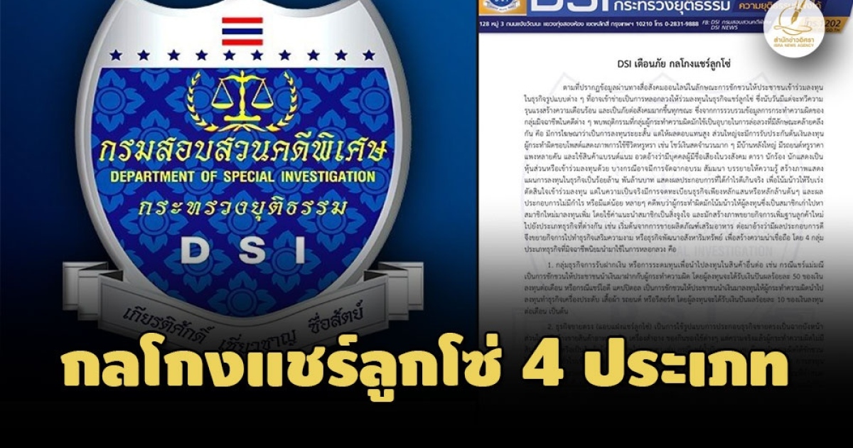 กรมสอบสวนคดีพิเศษเตือนภัยกลโกงแชร์ลูกโซ่ผ่านธุรกิจ 4 ประเภท รับฝากเงิน-ขายตรง-ลงทุนธุรกิจพลังงาน-เก็งกำไรแลกเปลี่ยนสกุลเงินดิจิทัล