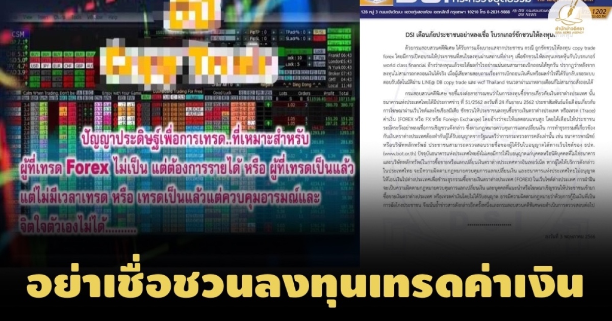 DSI เตือนประชาชนอย่าหลงเชื่อชวนลงทุนซื้อขายเงินตราต่างประเทศ ชี้ทำได้แค่ธนาคาร-บริษัทหลักทรัพย์ที่ได้รับอนุญาตเท่านั้น
