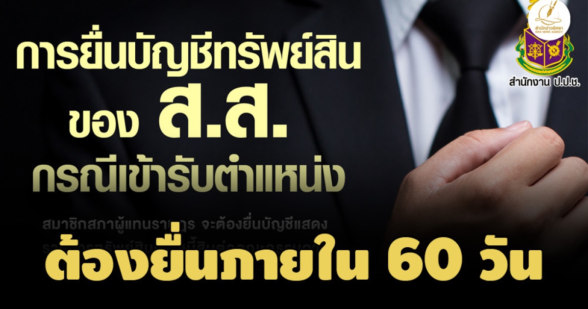 ป.ป.ช.ย้ำ ส.ส.ต้องยื่นบัญชีแสดงรายการทรัพย์สินและหนี้สินกรณีเข้ารับตำแหน่ง โดยถือวันปฏิญาณตนเป็นวันเข้ารับตำแหน่ง ภายใน 60 วัน หากมีเหตุผลความจำเป็นอาจยื่นขอขยายระยะเวลาได้อีกไม่เกิน 30 วัน